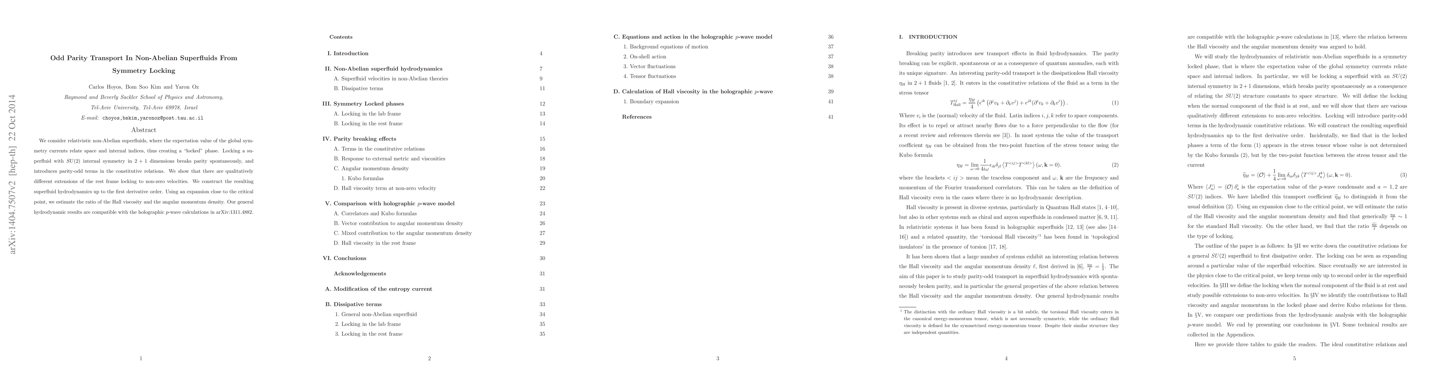 We consider relativistic non-Abelian superfluids, where the expectation value of the global symmetry currents relate space and internal indices, thus creating a "locked" phase. Locking a superfluid with SU(2) internal symmetry in 2+1 dimensions breaks parity spontaneously, and introduces parity-odd terms in the constitutive relations. We show that there are qualitatively different extensions of the rest frame locking to non-zero velocities. We construct the resulting superfluid hydrodynamics up to the first derivative order. Using an expansion close to the critical point, we estimate the ratio of the Hall viscosity and the angular momentum density. Our general hydrodynamic results are compatible with the holographic p-wave calculations in arXiv:1311.4882.