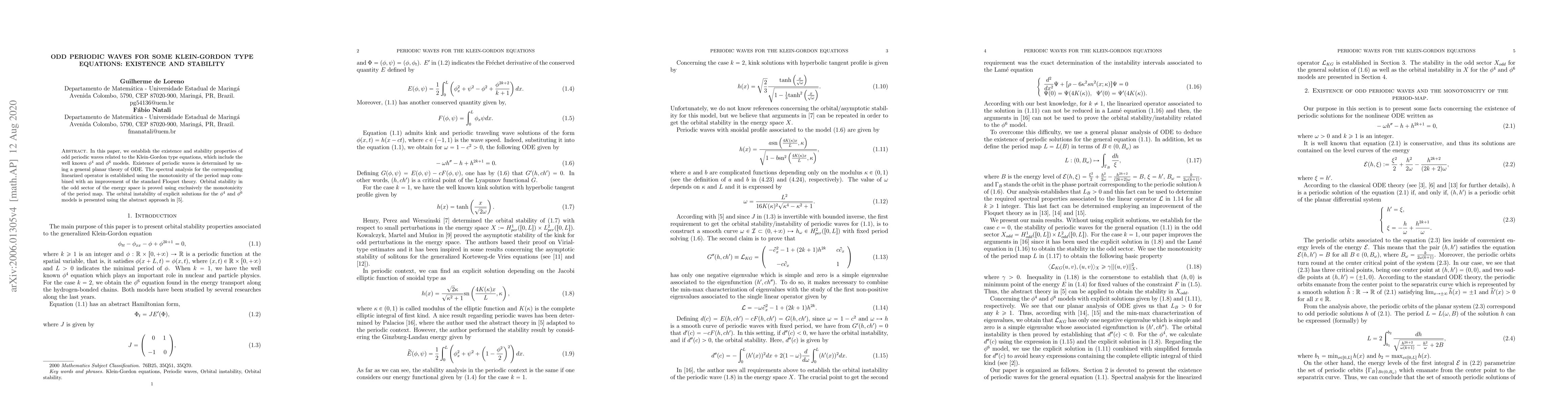 This paper proves the existence and stability of odd periodic waves for Klein-Gordon type equations like $phi^4$ and $phi^6$ models. It uses ODE theory for existence, spectral analysis with period map monotonicity for stability, and abstract approach for instability.