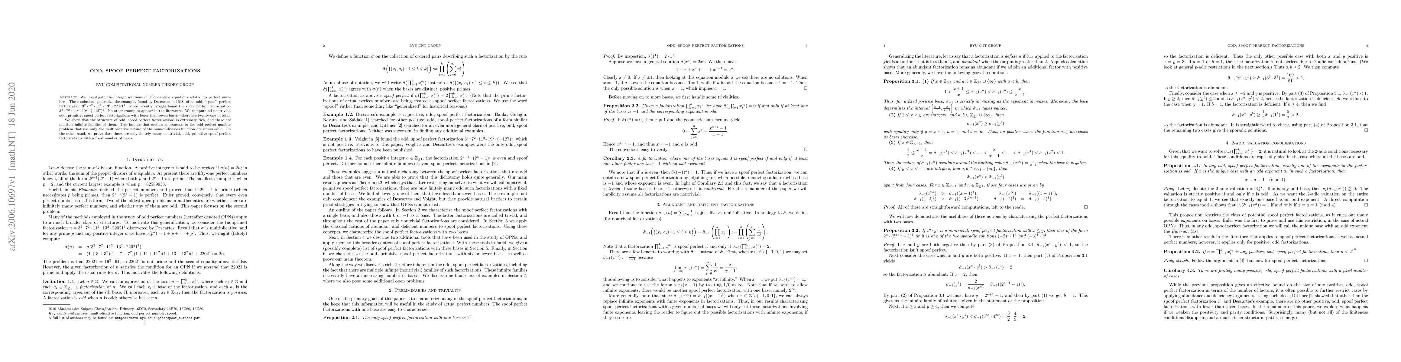 We investigate the integer solutions of Diophantine equations related to perfect numbers. These solutions generalize the example, found by Descartes in 1638, of an odd, ``spoof'' perfect factorization $3^2\cdot 7^2\cdot 11^2\cdot 13^2\cdot 22021^1$. More recently, Voight found the spoof perfect factorization $3^4\cdot 7^2\cdot 11^2\cdot 19^2\cdot(-127)^1$. No other examples appear in the literature. We compute all nontrivial, odd, primitive spoof perfect factorizations with fewer than seven bases -- there are twenty-one in total. We show that the structure of odd, spoof perfect factorizations is extremely rich, and there are multiple infinite families of them. This implies that certain approaches to the odd perfect number problem that use only the multiplicative nature of the sum-of-divisors function are unworkable. On the other hand, we prove that there are only finitely many nontrivial, odd, primitive spoof perfect factorizations with a fixed number of bases.