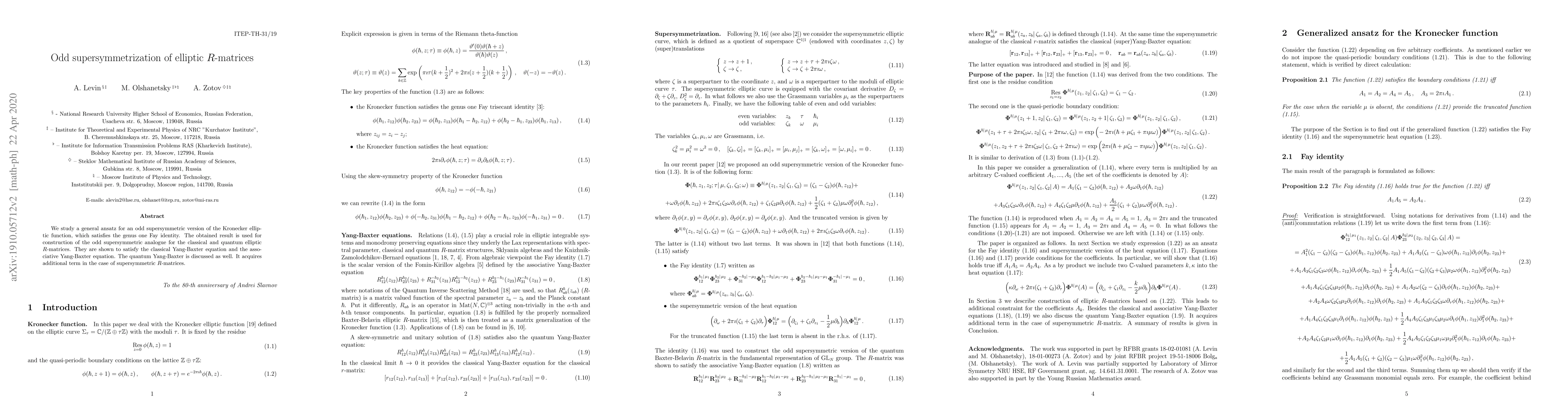 We study a general ansatz for an odd supersymmetric version of the Kronecker elliptic function, which satisfies the genus one Fay identity. The obtained result is used for construction of the odd supersymmetric analogue for the classical and quantum elliptic $R$-matrices. They are shown to satisfy the classical Yang-Baxter equation and the associative Yang-Baxter equation. The quantum Yang-Baxter is discussed as well. It acquires additional term in the case of supersymmetric $R$-matrices.