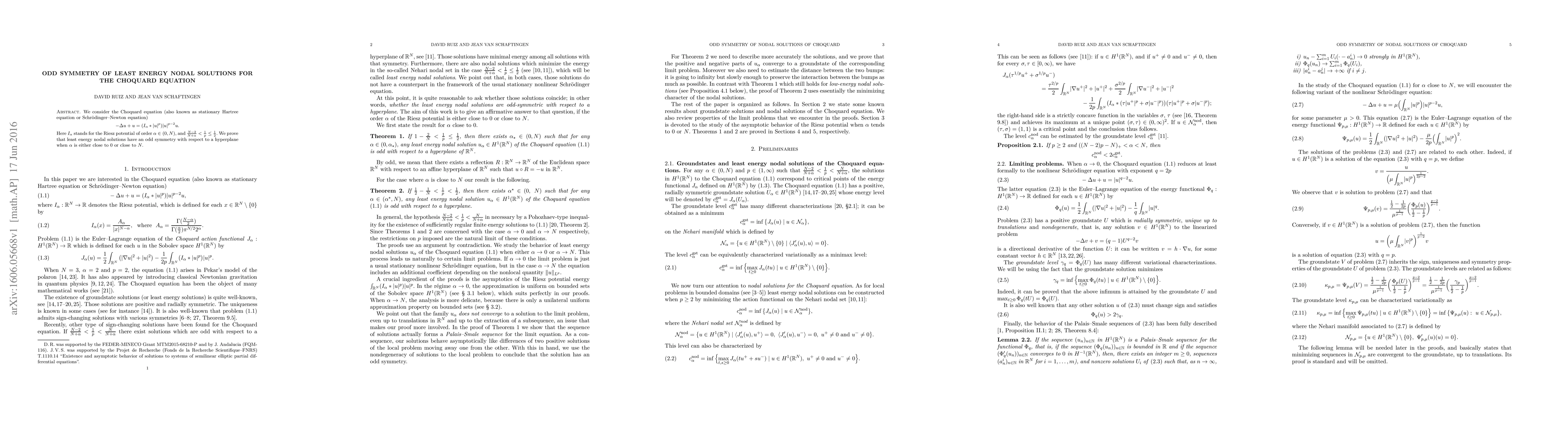 We consider the Choquard equation (also known as stationary Hartree equation or Schr\"odinger--Newton equation) \[ -\Delta u + u = (I_\alpha \star |u|^p) |u|^{p - 2}u. \] Here $I_\alpha$ stands for the Riesz potential of order $\alpha \in (0,N)$, and $\frac{N - 2}{N + \alpha} < \frac{1}{p} \le \frac{1}{2}$. We prove that least energy nodal solutions have an odd symmetry with respect to a hyperplane when $\alpha $ is either close to $0$ or close to $N$.