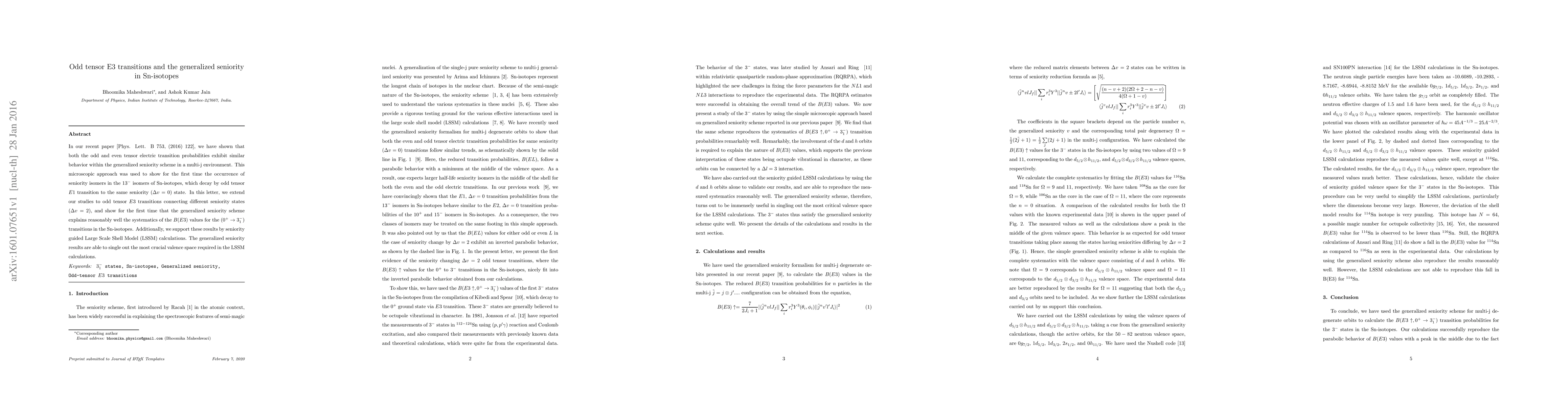This paper extends the generalized seniority scheme to odd tensor $E3$ transitions in Sn-isotopes, demonstrating its effectiveness in explaining $B(E3)$ values for $(0^+ \rightarrow 3_1^-)$ transitions. Seniority guided Large Scale Shell Model calculations support the findings, highlighting the essential valence space for these transitions.