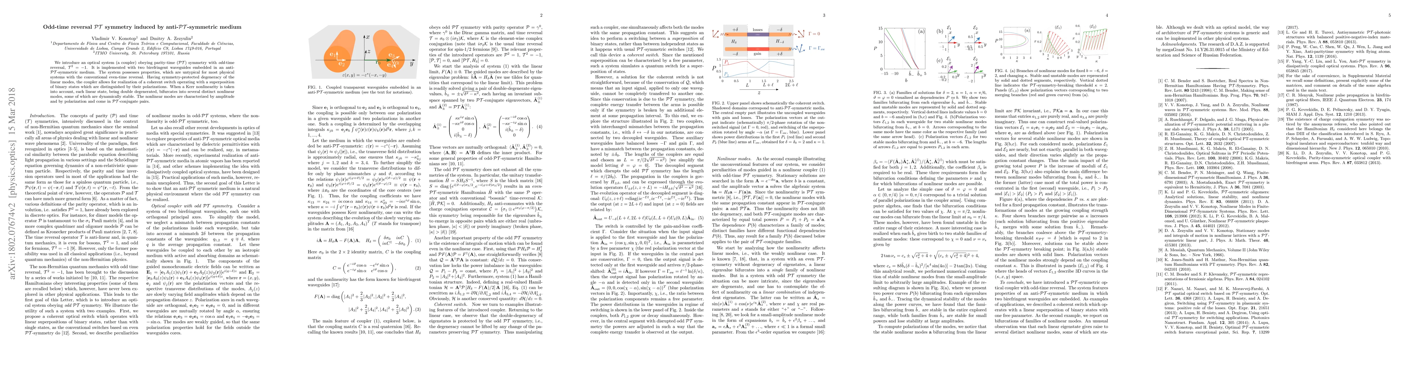We introduce an optical system (a coupler) obeying parity-time ($PT$) symmetry with odd-time reversal, $T^2=-1$. It is implemented with two birefringent waveguides embedded in an anti-$PT$-symmetric medium. The system possesses properties which are untypical for most physical systems with the conventional even-time reversal. Having symmetry-protected degeneracy of the linear modes, the coupler allows for realization of a coherent switch operating with a superposition of binary states which are distinguished by their polarizations. When a Kerr nonlinearity is taken into account, each linear state, being double degenerated, bifurcates into several distinct nonlinear modes, some of which are dynamically stable. The nonlinear modes are characterized by amplitude and by polarization and come in $PT$-conjugate pairs.