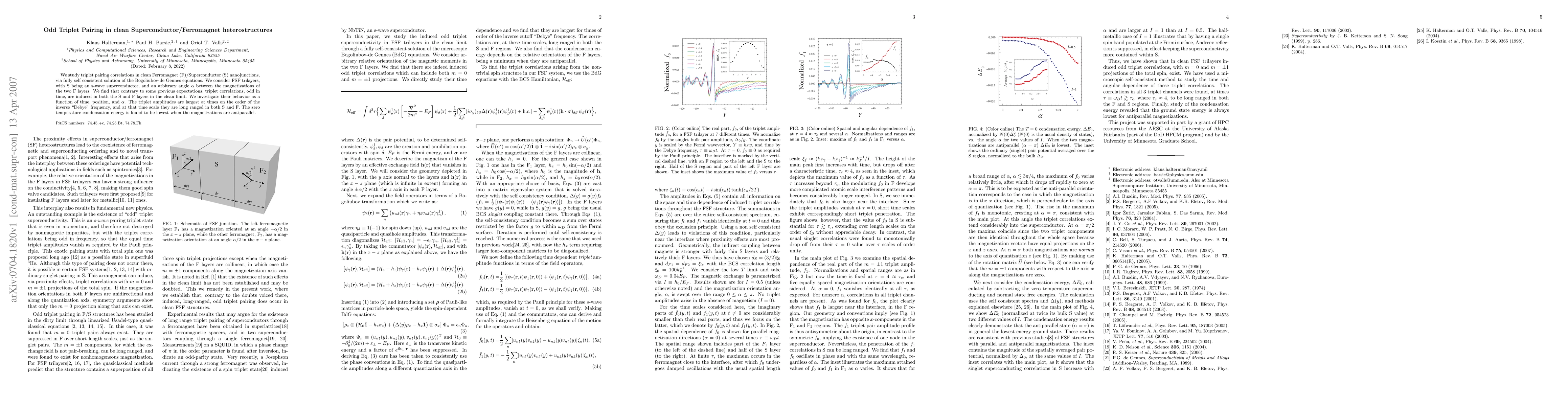 We study triplet pairing correlations in clean Ferromagnet (F)/Superconductor (S) nanojunctions, via fully self consistent solution of the Bogoliubov-de Gennes equations. We consider FSF trilayers, with S being an s-wave superconductor, and an arbitrary angle $\alpha$ between the magnetizations of the two F layers. We find that contrary to some previous expectations, triplet correlations, odd in time, are induced in both the S and F layers in the clean limit. We investigate their behavior as a function of time, position, and $\alpha$. The triplet amplitudes are largest at times on the order of the inverse ``Debye'' frequency, and at that time scale they are long ranged in both S and F. The zero temperature condensation energy is found to be lowest when the magnetizations are antiparallel.