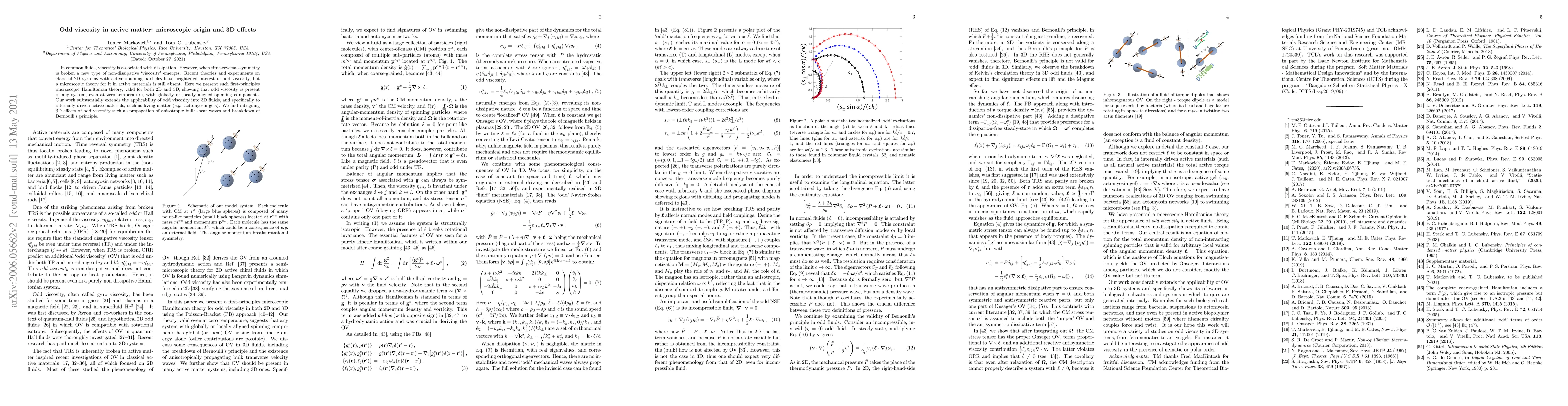 This paper develops a microscopic Hamiltonian theory for odd viscosity in active matter, showing its presence in systems with aligned spinning components. It extends the concept to 3D active materials, revealing unique effects like anisotropic bulk shear waves and the breakdown of Bernoulli's principle.