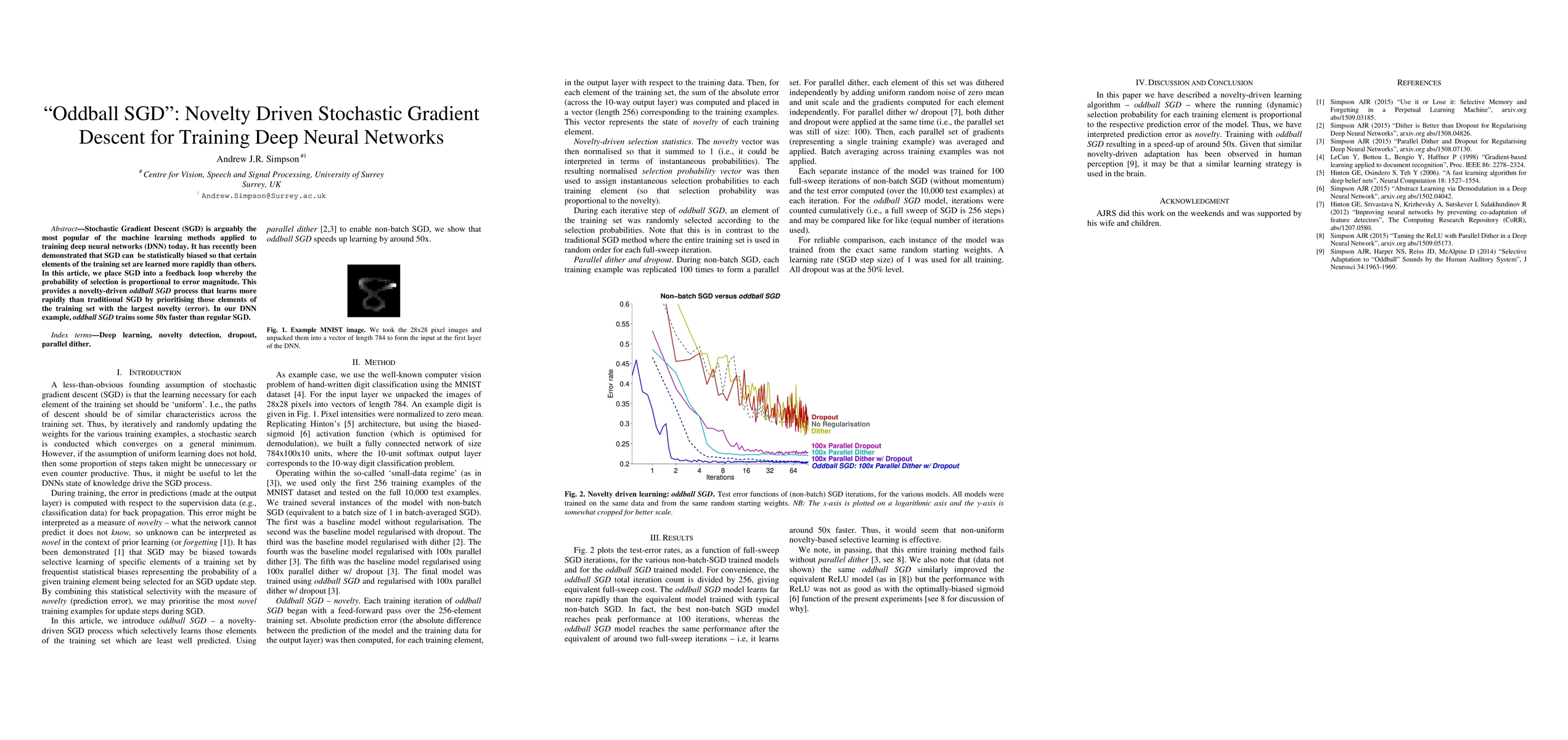 This paper introduces "Oddball SGD," a novel approach that prioritizes training elements with higher error magnitudes, thus speeding up learning in deep neural networks. Compared to traditional SGD, oddball SGD trains up to 50 times faster by focusing on more novel (error-prone) data points.