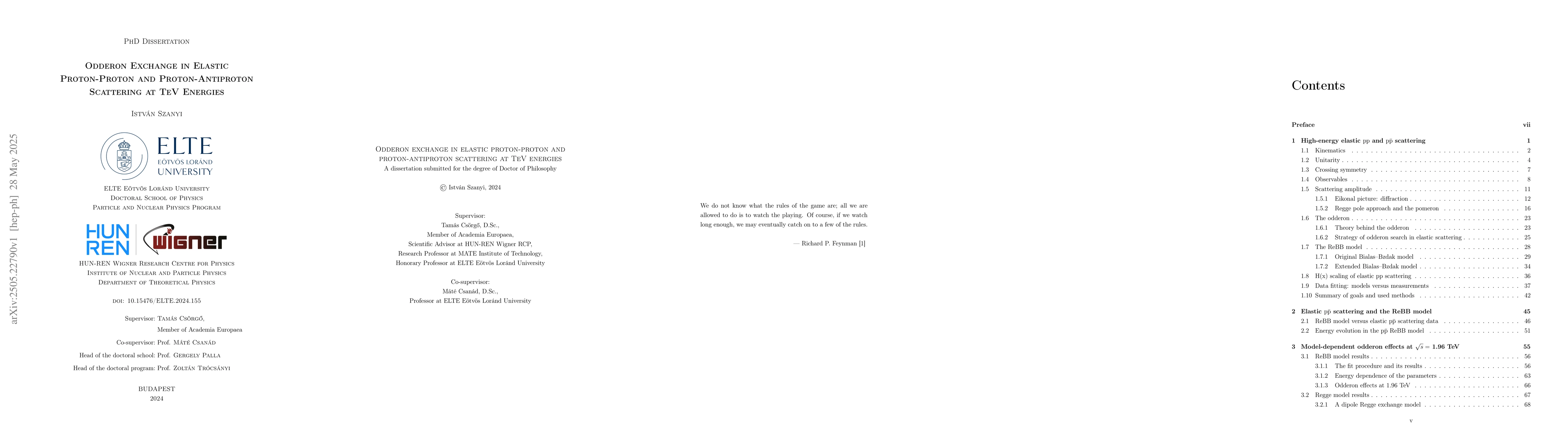The dissertation details the observation and analysis of odderon exchange in elastic hadronic processes, contributing to the understanding of strong interaction physics in the nonperturbative regime.