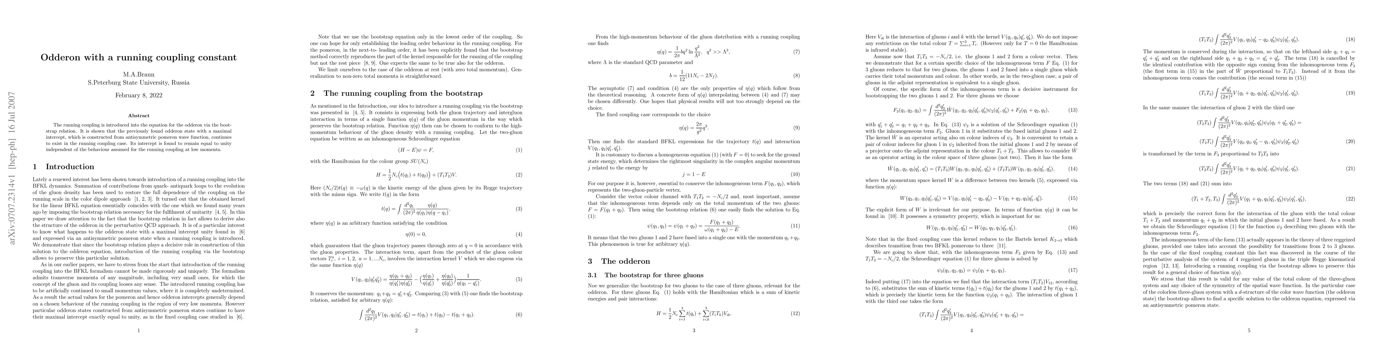 The paper introduces a running coupling constant into the odderon equation via the bootstrap relation, demonstrating that the maximal intercept odderon state persists, maintaining an intercept of unity regardless of the running coupling's behavior at low momenta.