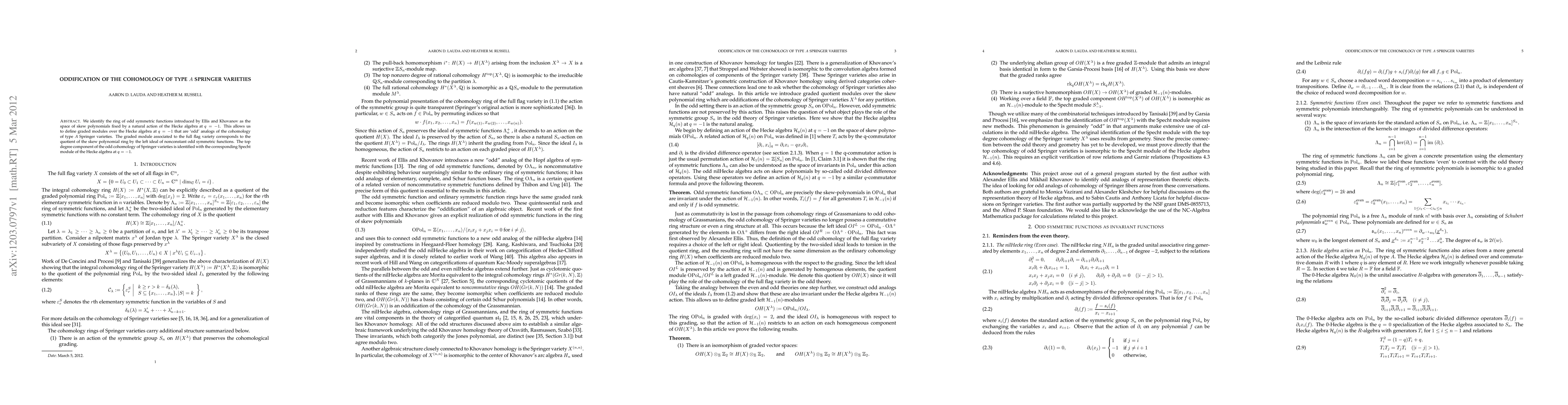 This paper identifies the ring of odd symmetric functions as the fixed skew polynomials under the Hecke algebra at q=-1, defining graded modules that serve as odd analogs of type A Springer variety cohomologies. The top degree component of these odd cohomologies corresponds to the Specht module of the Hecke algebra at q=-1.