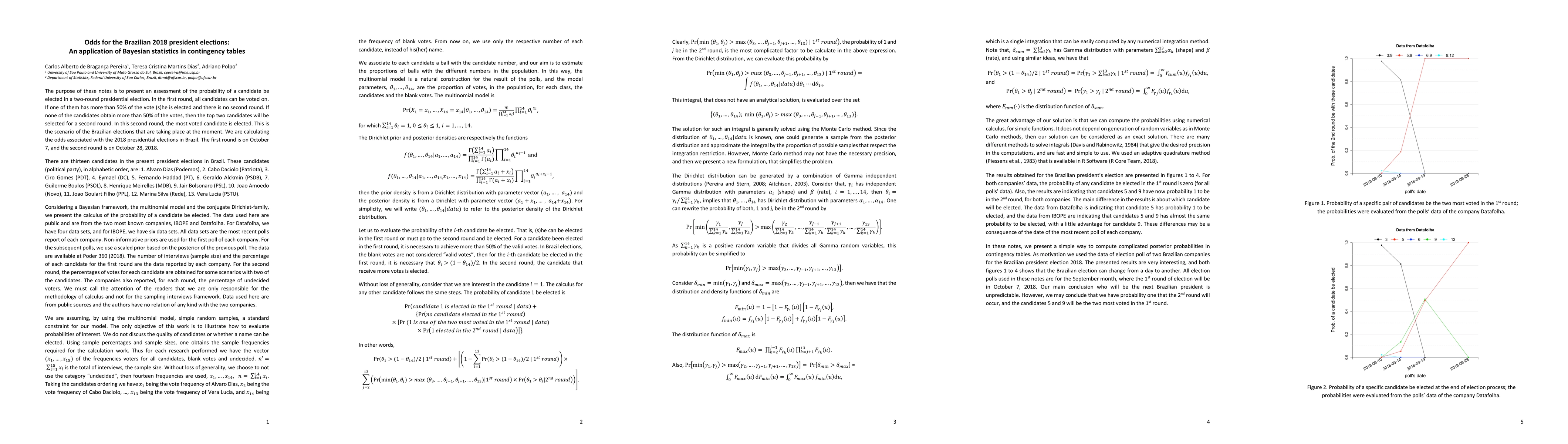 This paper uses Bayesian statistics to assess the probability of candidates winning in Brazil's 2018 presidential election, which involves a two-round voting system. The first round determines if any candidate secures over 50% of the votes, and if not, the top two candidates proceed to a second round.