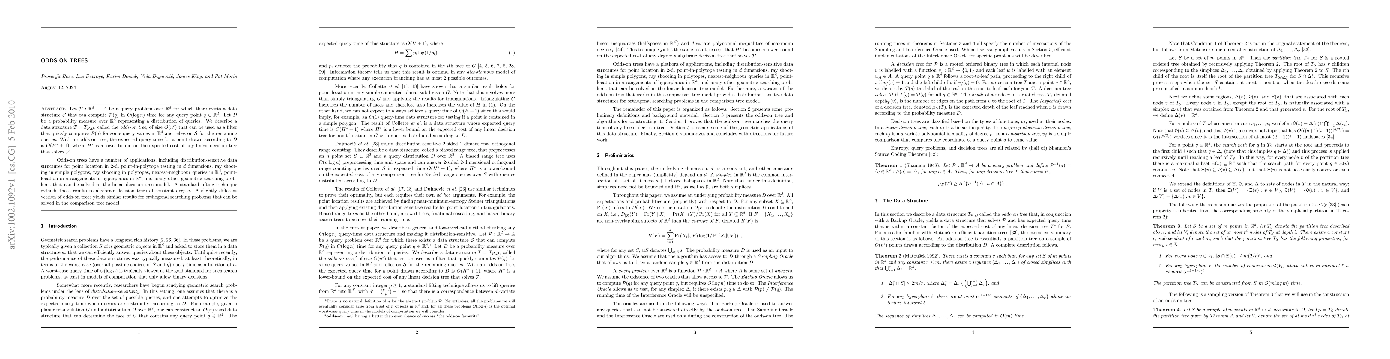 A new data structure called odds-on trees can efficiently compute query probabilities in O(log n) time for some queries, with an expected query time of O(H*+1), and has applications in various geometric searching problems.