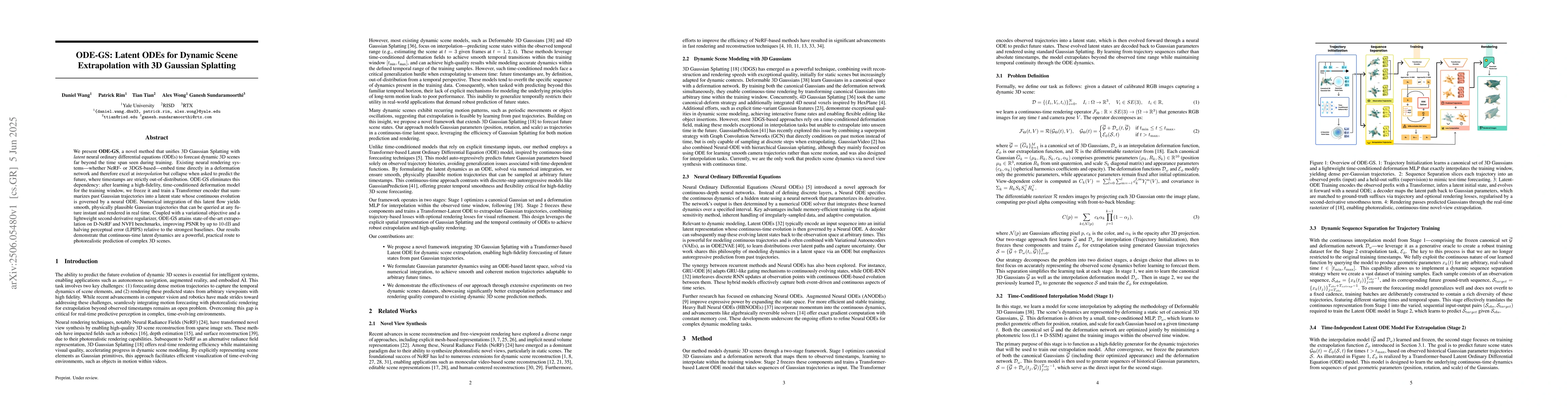 ODE-GS introduces a novel approach that unifies 3D Gaussian Splatting with latent neural ODEs for dynamic scene extrapolation, enabling smooth and plausible future trajectory predictions.