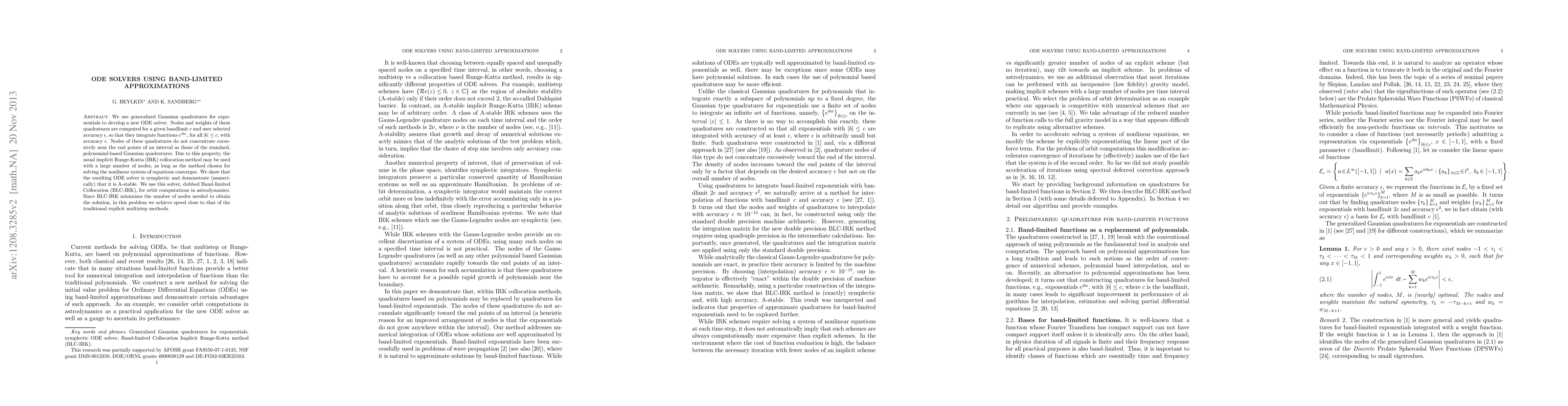 We use generalized Gaussian quadratures for exponentials to develop a new ODE solver. Nodes and weights of these quadratures are computed for a given bandlimit $c$ and user selected accuracy $\epsilon$, so that they integrate functions $e^{ibx}$, for all $|b|\le c$, with accuracy $\epsilon$. Nodes of these quadratures do not concentrate excessively near the end points of an interval as those of the standard, polynomial-based Gaussian quadratures. Due to this property, the usual implicit Runge Kutta (IRK) collocation method may be used with a large number of nodes, as long as the method chosen for solving the nonlinear system of equations converges. We show that the resulting ODE solver is symplectic and demonstrate (numerically) that it is A-stable. We use this solver, dubbed Band-limited Collocation (BLC-IRK), in the problem of orbit determination. Since BLC-IRK minimizes the number of nodes needed to obtain the solution, in this problem we achieve speed close to that of explicit multistep methods.