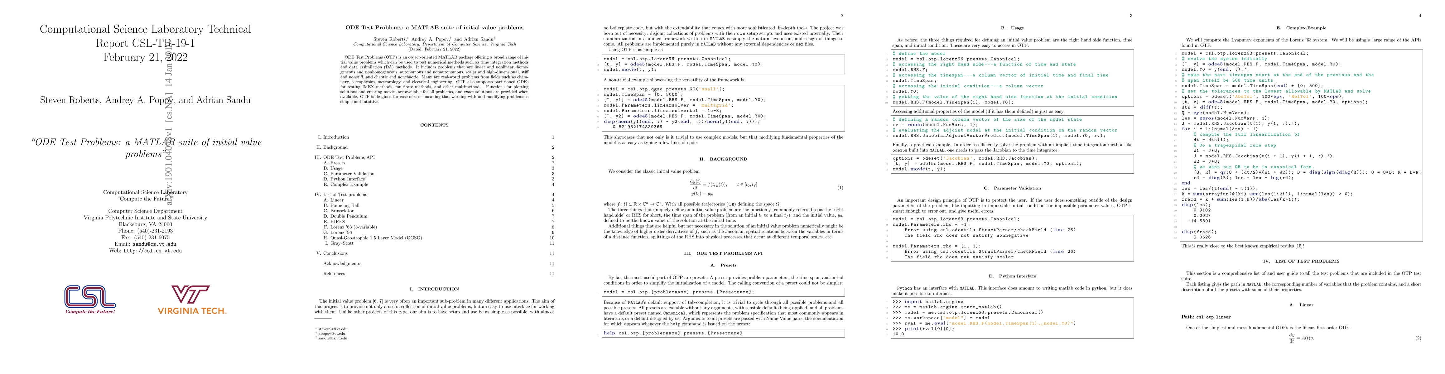 ODE Test Problems (OTP) is a MATLAB suite providing a comprehensive collection of initial value problems for testing numerical methods, including real-world applications from various fields. It supports a wide range of problem types and features tools for visualization and solution analysis.