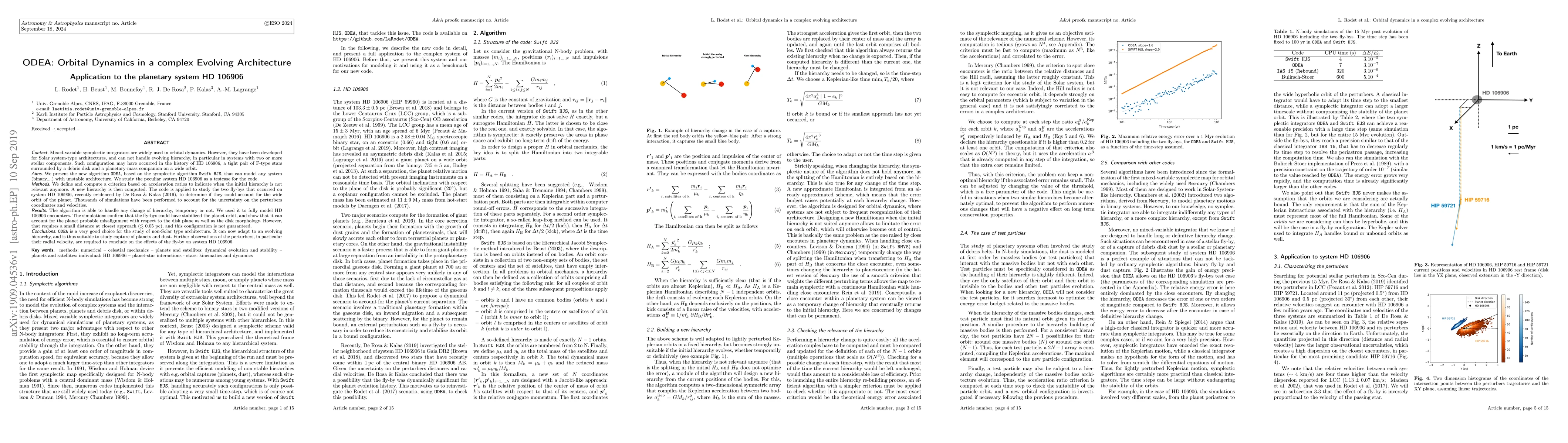 Mixed-variable symplectic integrators are widely used in orbital dynamics. However, they have been developed for Solar system-type architectures, and can not handle evolving hierarchy, in particular in systems with two or more stellar components. Such configuration may have occurred in the history of HD 106906, a tight pair of F-type stars surrounded by a debris disk and a planetary-mass companion on a wide orbit. We present the new algorithm ODEA, based on the symplectic algorithm SWIFT HJS, that can model any system (binary,...) with unstable architecture. We study the peculiar system HD 106906 as a testcase for the code. We define and compute a criterion based on acceleration ratios to indicate when the initial hierarchy is not relevant anymore. A new hierarchy is then computed. The code is applied to study the two fly-bys that occurred on system HD 106906, recently evidenced by De Rosa & Kalas (2019), to determine if they could account for the wide orbit of the planet. Thousands of simulations have been performed to account for the uncertainty on the perturbers coordinates and velocities. The algorithm is able to handle any change of hierarchy, temporary or not. We used it to fully model HD 106906 encounters. The simulations confirm that the fly-bys could have stabilized the planet orbit, and show that it can account for the planet probable misalignment with respect to the disk plane as well as the disk morphology. However, that requires a small distance at closest approach (< 0.05 pc), and this configuration is not guaranteed. ODEA is a very good choice for the study of non-Solar type architecture. It can now adapt to an evolving hierarchy, and is thus suitable to study capture of planets and dust. Further observations of the perturbers, in particular their radial velocity, are required to conclude on the effects of the fly-by on system HD 106906.