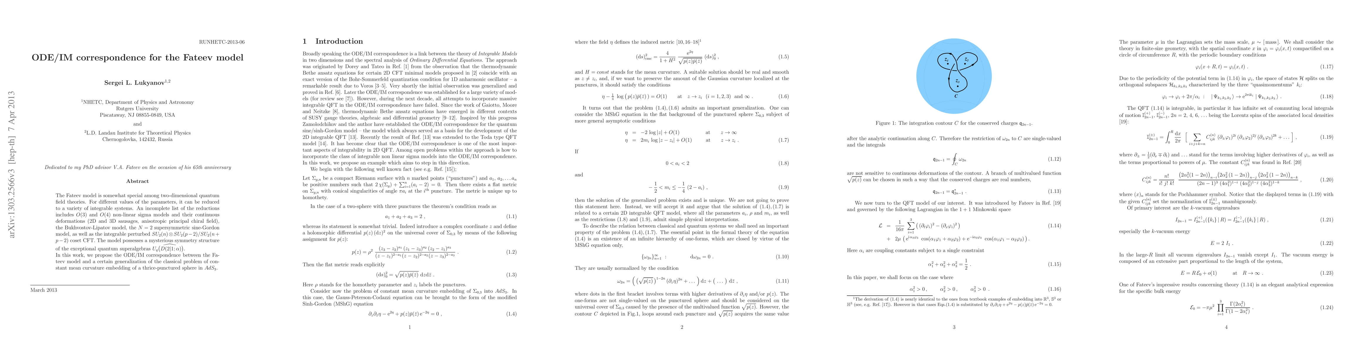 The Fateev model is somewhat special among two-dimensional quantum field theories. For different values of the parameters,it can be reduced to a variety of integrable systems. An incomplete list of the reductions includes O(3) and O(4) non-linear sigma models and their continuous deformations (2D and 3D sausages, anisotropic principal chiral field), the Bukhvostov-Lipatov model, the N=2 supersymmetric sine-Gordon model, as well as the integrable perturbed SU_2(n)\otimes SU_2(p-2)/SU_2(n+p-2) coset CFT. The model possesses a mysterious symmetry structure of the exceptional quantum superalgebras U_q{\hat{\big(D(2|1;\alpha)}}\big). In this work, we propose the ODE/IM correspondence between the Fateev model and a certain generalization of the classical problem of constant mean curvature embedding of a thrice-punctured sphere in AdS_3.