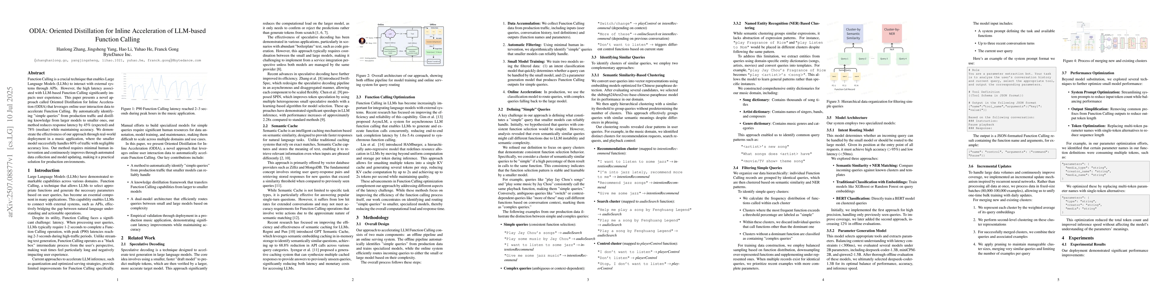 Function Calling is a crucial technique that enables Large Language Models (LLMs) to interact with external systems through APIs. However, the high latency associated with LLM-based Function Calling significantly impacts user experience. This paper presents a novel approach called Oriented Distillation for Inline Acceleration (ODIA) that leverages online user interaction data to accelerate Function Calling. By automatically identifying "simple queries" from production traffic and distilling knowledge from larger models to smaller ones, our method reduces response latency by 45% (expected) and 78% (median) while maintaining accuracy. We demonstrate the effectiveness of our approach through real-world deployment in a music application, where the smaller model successfully handles 60% of traffic with negligible accuracy loss. Our method requires minimal human intervention and continuously improves through automated data collection and model updating, making it a practical solution for production environments.