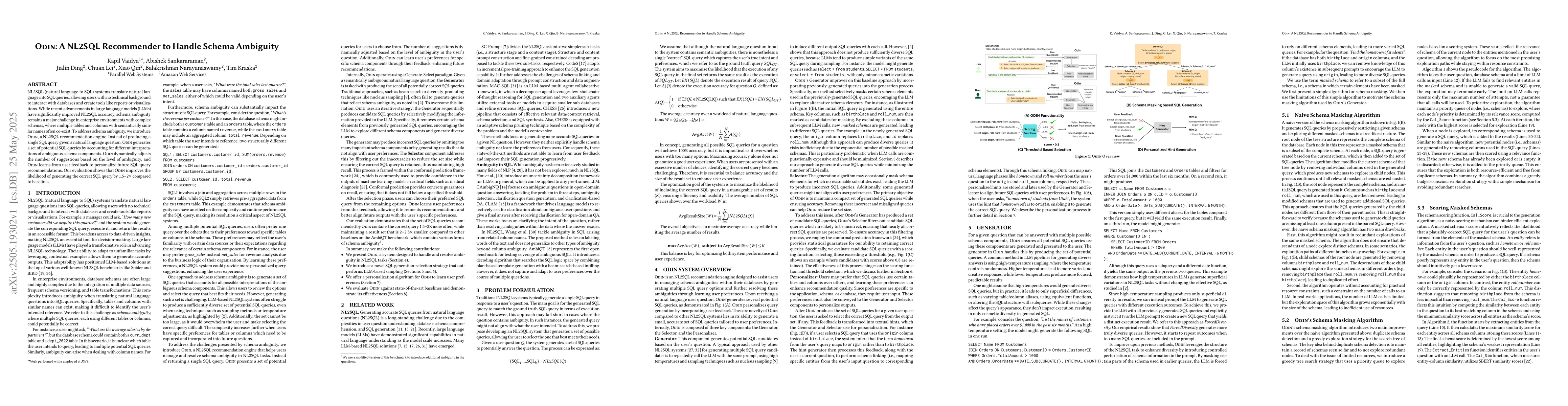 The paper introduces ODIN, a NL2SQL recommendation engine that generates a set of potential SQL queries considering different interpretations of ambiguous schema components, adjusting suggestions based on ambiguity levels and learning from user feedback.