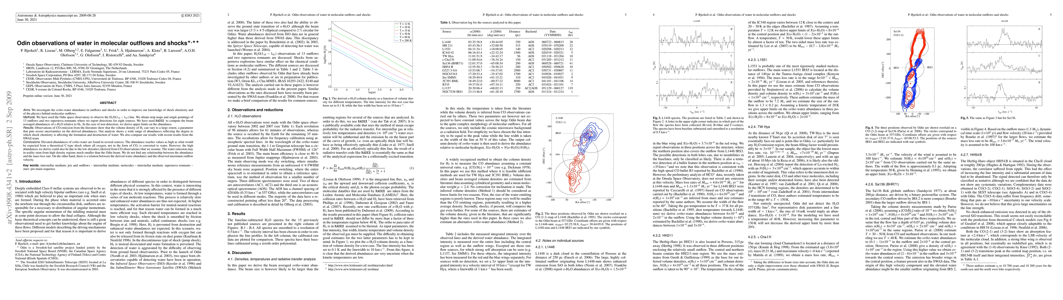 Aims. We investigate the ortho-water abundance in outflows and shocks in order to improve our knowledge of shock chemistry and of the physics behind molecular outflows. Methods. We have used the Odin space observatory to observe the H2O(110-101) line. We obtain strip maps and single pointings of 13 outflows and two supernova remnants where we report detections for eight sources. We have used RADEX to compute the beam averaged abundances of o-H2O relative to H2. In the case of non-detection, we derive upper limits on the abundance. Results. Observations of CO emission from the literature show that the volume density of H2 can vary to a large extent, a parameter that puts severe uncertainties on the derived abundances. Our analysis shows a wide range of abundances reflecting the degree to which shock chemistry is affecting the formation and destruction of water. We also compare our results with recent results from the SWAS team. Conclusions. Elevated abundances of ortho-water are found in several sources. The abundance reaches values as high as what would be expected from a theoretical C-type shock where all oxygen, not in the form of CO, is converted to water. However, the high abundances we derive could also be due to the low densities (derived from CO observations) that we assume. The water emission may in reality stem from high density regions much smaller than the Odin beam. We do not find any relationship between the abundance and the mass loss rate. On the other hand, there is a relation between the derived water abundance and the observed maximum outflow velocity.