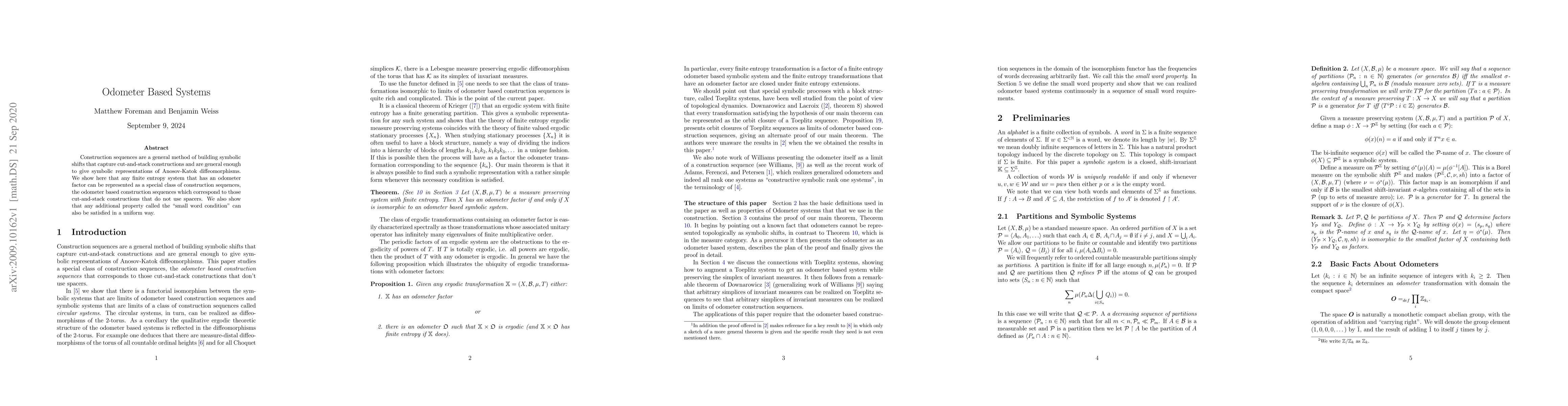 This paper explores odometer-based systems for constructing symbolic shifts, showing that finite entropy systems with odometer factors can be represented by a specific type of construction sequence that excludes spacers. It also demonstrates the uniform satisfaction of the "small word condition" in these constructions.