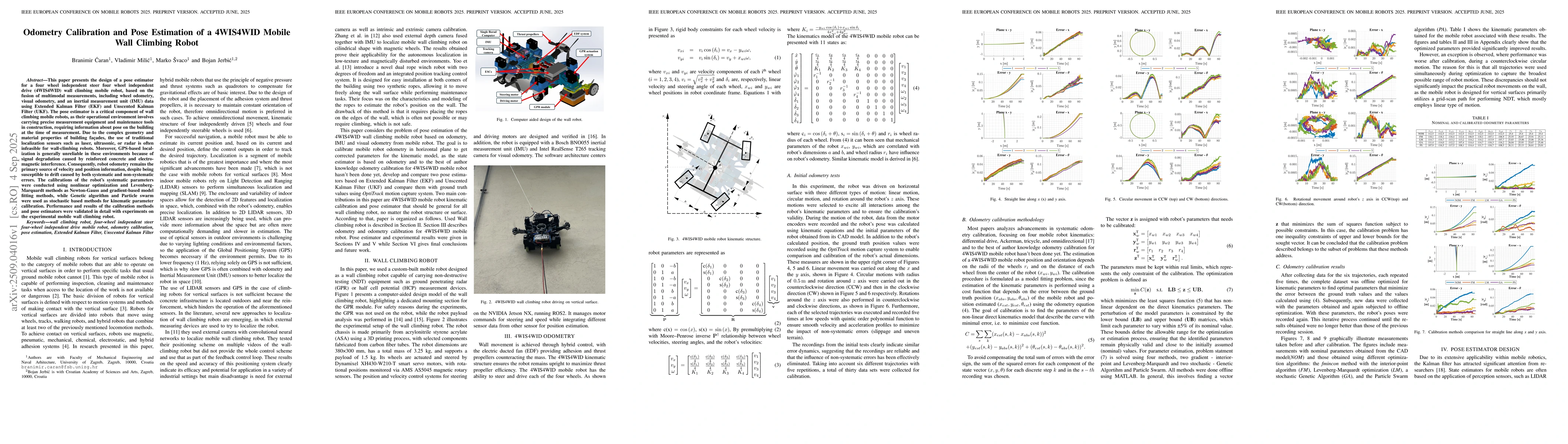 This paper presents the design of a pose estimator for a four wheel independent steer four wheel independent drive (4WIS4WID) wall climbing mobile robot, based on the fusion of multimodal measurements, including wheel odometry, visual odometry, and an inertial measurement unit (IMU) data using Extended Kalman Filter (EKF) and Unscented Kalman Filter (UKF). The pose estimator is a critical component of wall climbing mobile robots, as their operational environment involves carrying precise measurement equipment and maintenance tools in construction, requiring information about pose on the building at the time of measurement. Due to the complex geometry and material properties of building facades, the use of traditional localization sensors such as laser, ultrasonic, or radar is often infeasible for wall-climbing robots. Moreover, GPS-based localization is generally unreliable in these environments because of signal degradation caused by reinforced concrete and electromagnetic interference. Consequently, robot odometry remains the primary source of velocity and position information, despite being susceptible to drift caused by both systematic and non-systematic errors. The calibrations of the robot's systematic parameters were conducted using nonlinear optimization and Levenberg-Marquardt methods as Newton-Gauss and gradient-based model fitting methods, while Genetic algorithm and Particle swarm were used as stochastic-based methods for kinematic parameter calibration. Performance and results of the calibration methods and pose estimators were validated in detail with experiments on the experimental mobile wall climbing robot.