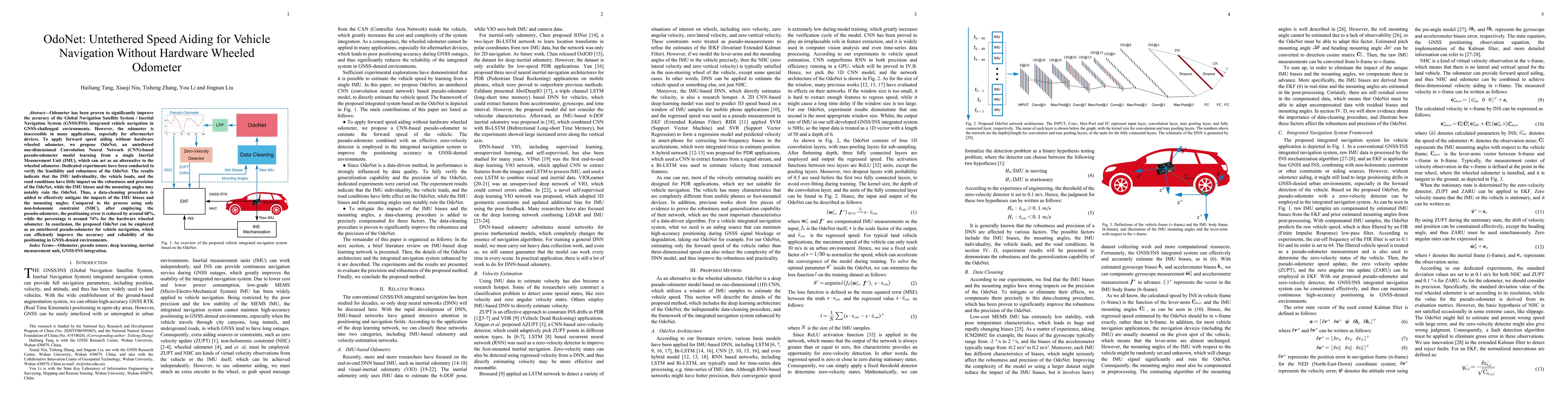 OdoNet is a CNN-based pseudo-odometer model that uses a single Inertial Measurement Unit (IMU) to simulate the function of a traditional wheeled odometer for vehicle navigation without hardware. Experiments show that OdoNet significantly reduces positioning errors by around 68% compared to non-holonomic constraints, though IMU biases and mounting angles can affect its precision.
