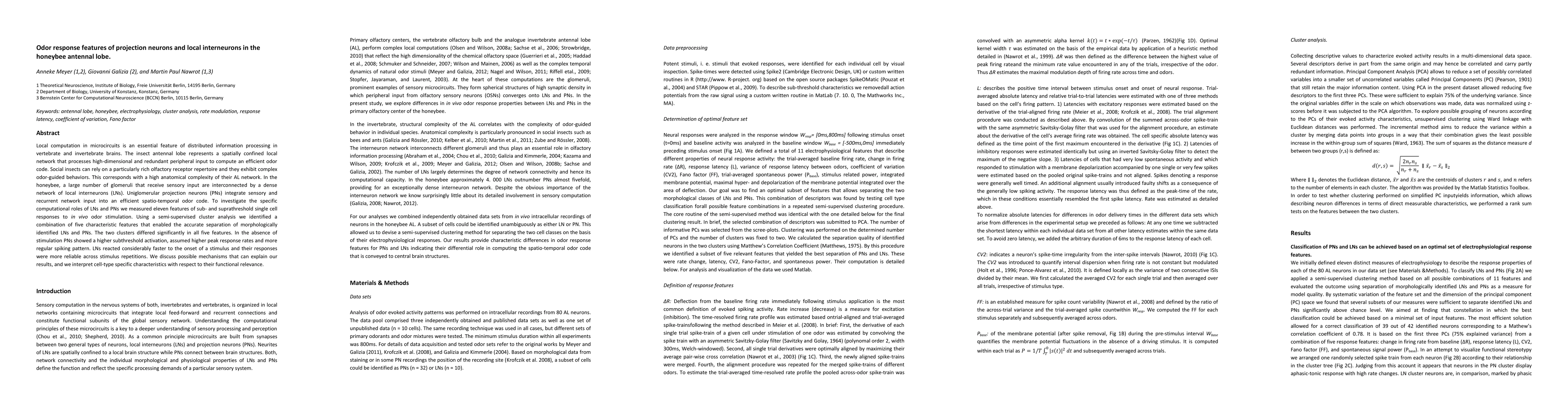 Local computation in microcircuits is an essential feature of distributed information processing in vertebrate and invertebrate brains. The insect antennal lobe represents a spatially confined local network that processes high-dimensional and redundant peripheral input to compute an efficient odor code. Social insects can rely on a particularly rich olfactory receptor repertoire and they exhibit complex odor-guided behaviors. This corresponds with a high anatomical complexity of their AL network. In the honeybee, a large number of glomeruli that receive sensory input are interconnected by a dense network of local interneurons (LNs). Uniglomerular projection neurons (PNs) integrate sensory and recurrent network input into an efficient spatio-temporal odor code. To investigate the specific computational roles of LNs and PNs we measured eleven features of sub- and suprathreshold single cell responses to in vivo odor stimulation. Using a semi-supervised cluster analysis we identified a combination of five characteristic features that enabled the accurate separation of morphologically identified LNs and PNs. The two clusters differed significantly in all five features. In the absence of stimulation PNs showed a higher subthreshold activation, assumed higher peak response rates and more regular spiking pattern. LNs reacted considerably faster to the onset of a stimulus and their responses were more reliable across stimulus repetitions. We discuss possible mechanisms that can explain our results, and we interpret cell-type specific characteristics with respect to their functional relevance.