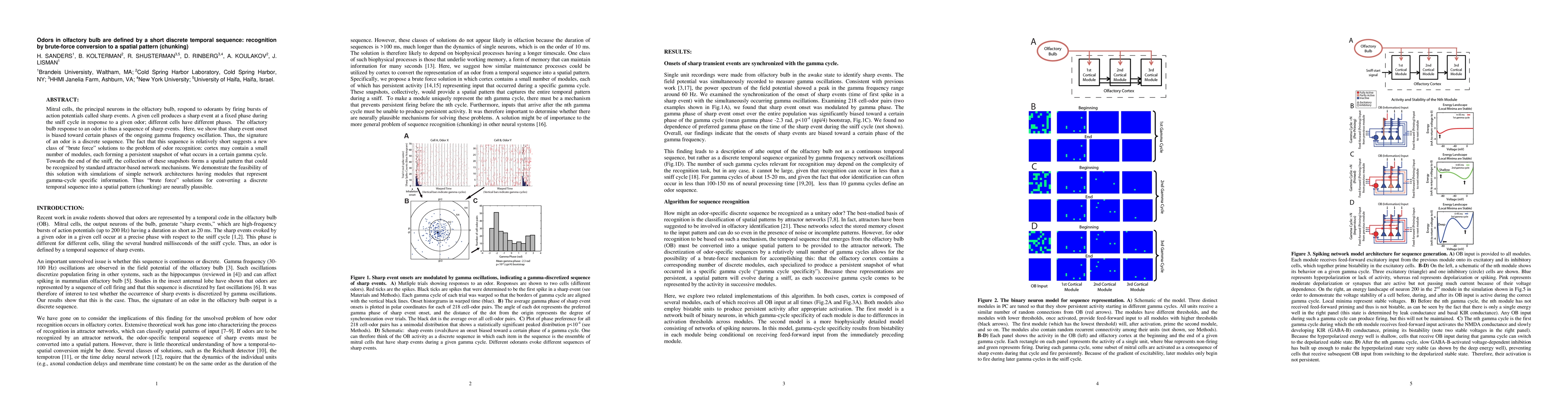Mitral cells, the principal neurons in the olfactory bulb, respond to odorants by firing bursts of action potentials called sharp events. A given cell produces a sharp event at a fixed phase during the sniff cycle in response to a given odor; different cells have different phases. The olfactory bulb response to an odor is thus a sequence of sharp events. Here, we show that sharp event onset is biased toward certain phases of the ongoing gamma frequency oscillation. Thus, the signature of an odor is a discrete sequence. The fact that this sequence is relatively short suggests a new class of "brute force" solutions to the problem of odor recognition: cortex may contain a small number of modules, each forming a persistent snapshot of what occurs in a certain gamma cycle. Towards the end of the sniff, the collection of these snapshots forms a spatial pattern that could be recognized by standard attractor-based network mechanisms. We demonstrate the feasibility of this solution with simulations of simple network architectures having modules that represent gamma-cycle specific information. Thus "brute force" solutions for converting a discrete temporal sequence into a spatial pattern (chunking) are neurally plausible.