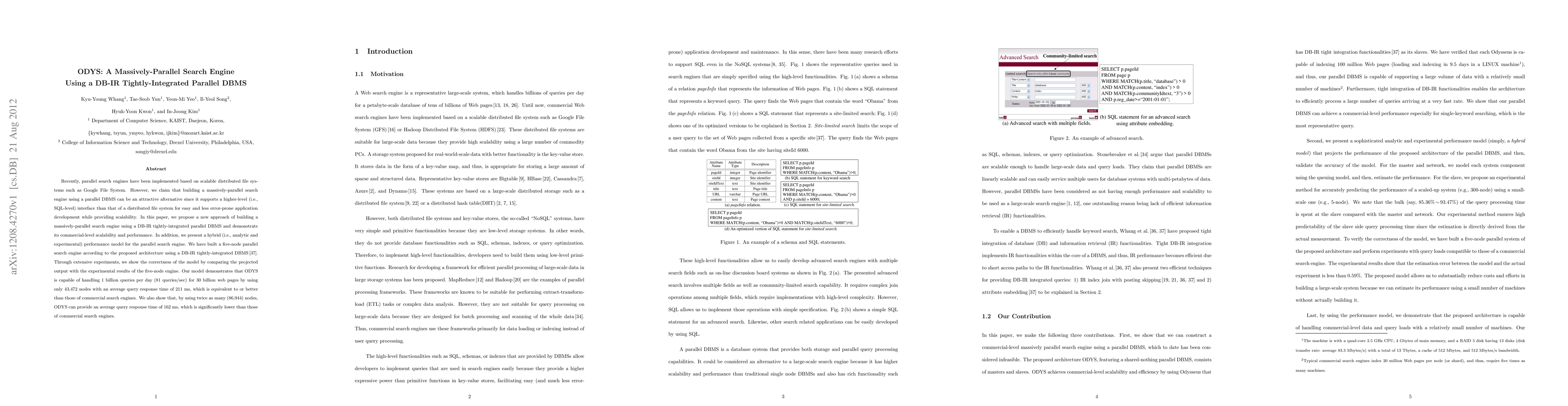 ODYS proposes a massively-parallel search engine using a DB-IR integrated parallel DBMS, demonstrating commercial-level scalability and performance, capable of handling 1 billion queries per day with competitive response times. The model validates the architecture's effectiveness through a five-node prototype, showing superior or equivalent performance to commercial search engines.