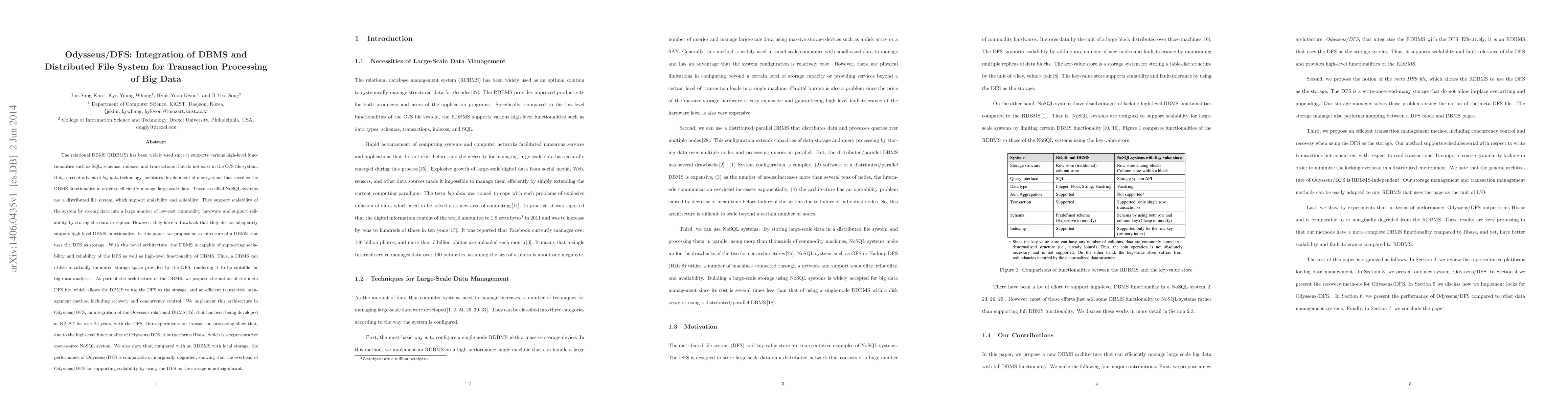 This paper proposes integrating a traditional relational DBMS with a distributed file system (DFS) to leverage the scalability and reliability of DFS while retaining high-level DBMS functionalities. The Odysseus/DFS system demonstrates improved transaction processing performance compared to HBase and shows comparable performance to local RDBMS, indicating minimal overhead from the DFS integration.