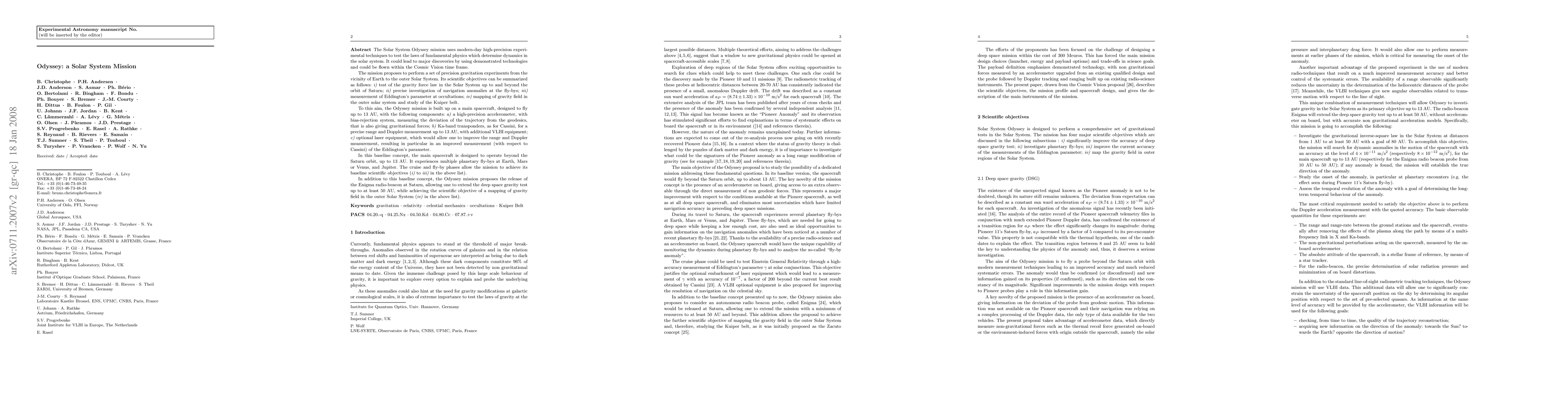 The Solar System Odyssey mission aims to test fundamental physics laws using high-precision experiments, focusing on precision gravitation tests from Earth to 13 AU, including fly-bys of multiple planets. It seeks to extend deep space gravity tests to 50 AU by releasing the Enigma radio-beacon at Saturn.