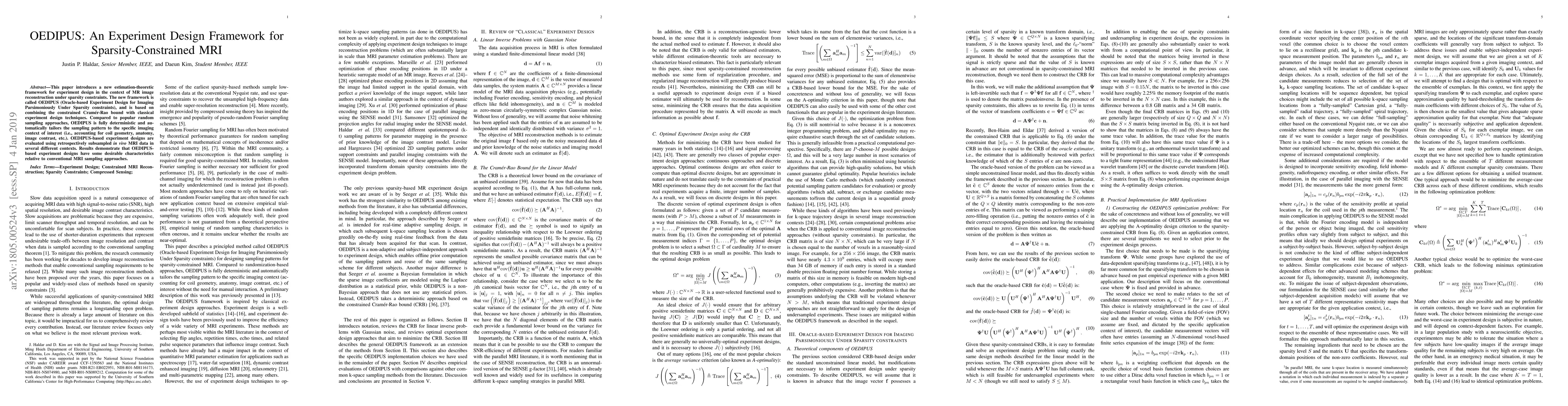 The OEDIPUS framework combines the constrained Cramér-Rao bound with classical experiment design techniques for MRI reconstruction under sparsity constraints, offering a deterministic approach that tailors sampling patterns to specific imaging contexts. Evaluations using in vivo MRI data show that OEDIPUS outperforms conventional sampling methods.