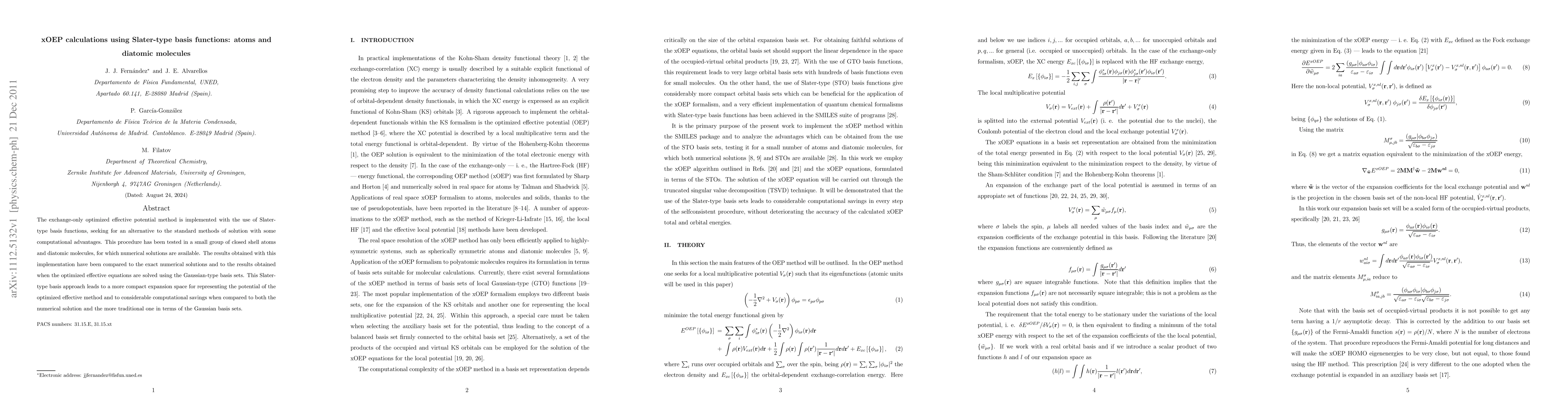 The exchange-only optimized effective potential method is implemented with the use of Slater-type basis functions, seeking for an alternative to the standard methods of solution with some computational advantages. This procedure has been tested in a small group of closed shell atoms and diatomic molecules, for which numerical solutions are available. The results obtained with this implementation have been compared to the exact numerical solutions and to the results obtained when the optimized effective equations are solved using the Gaussian-type basis sets. This Slater-type basis approach leads to a more compact expansion space for representing the potential of the optimized effective method and to considerable computational savings when compared to both the numerical solution and the more traditional one in terms of the Gaussian basis sets.