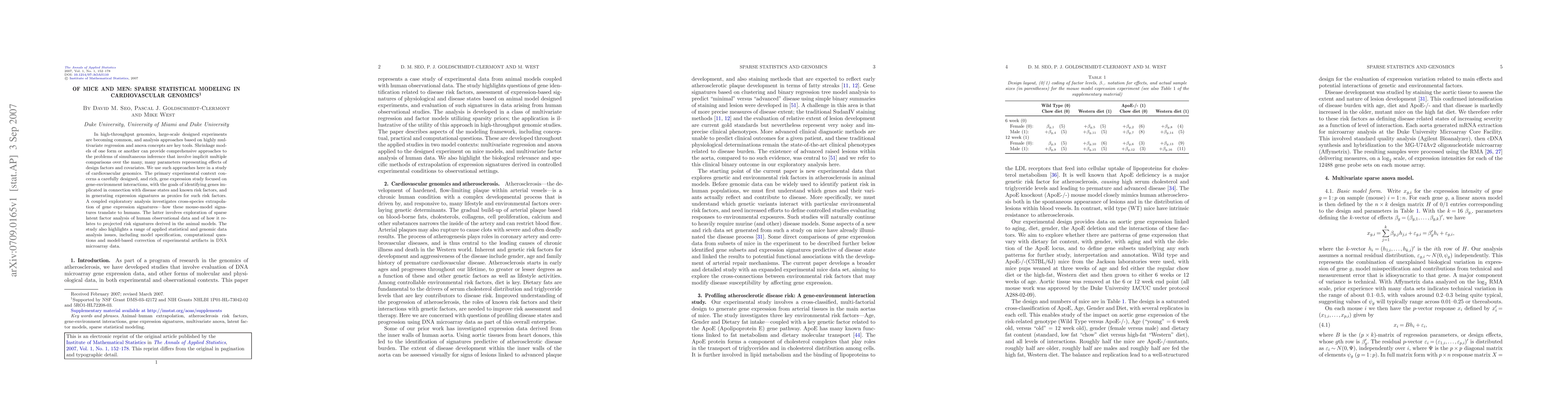 In high-throughput genomics, large-scale designed experiments are becoming common, and analysis approaches based on highly multivariate regression and anova concepts are key tools. Shrinkage models of one form or another can provide comprehensive approaches to the problems of simultaneous inference that involve implicit multiple comparisons over the many, many parameters representing effects of design factors and covariates. We use such approaches here in a study of cardiovascular genomics. The primary experimental context concerns a carefully designed, and rich, gene expression study focused on gene-environment interactions, with the goals of identifying genes implicated in connection with disease states and known risk factors, and in generating expression signatures as proxies for such risk factors. A coupled exploratory analysis investigates cross-species extrapolation of gene expression signatures--how these mouse-model signatures translate to humans. The latter involves exploration of sparse latent factor analysis of human observational data and of how it relates to projected risk signatures derived in the animal models. The study also highlights a range of applied statistical and genomic data analysis issues, including model specification, computational questions and model-based correction of experimental artifacts in DNA microarray data.