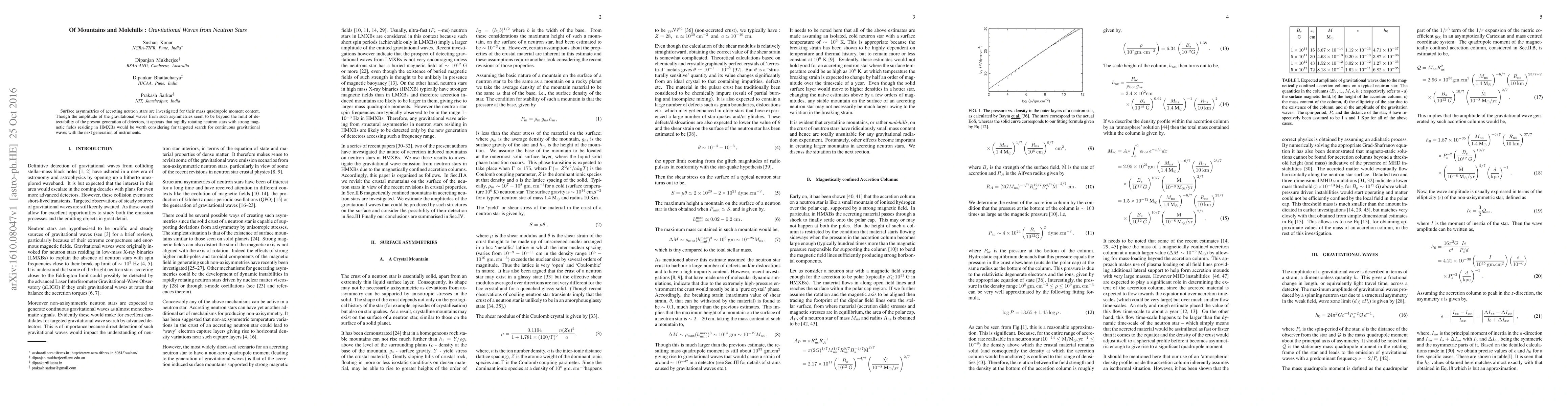 Surface asymmetries of accreting neutron stars are investigated for their mass quadrupole moment content. Though the amplitude of the gravitational waves from such asymmetries seem to be beyond the limit of detectability of the present generation of detectors, it appears that rapidly rotating neutron stars with strong magnetic fields residing in HMXBs would be worth considering for targeted search for continuous gravitational waves with the next generation of instruments.