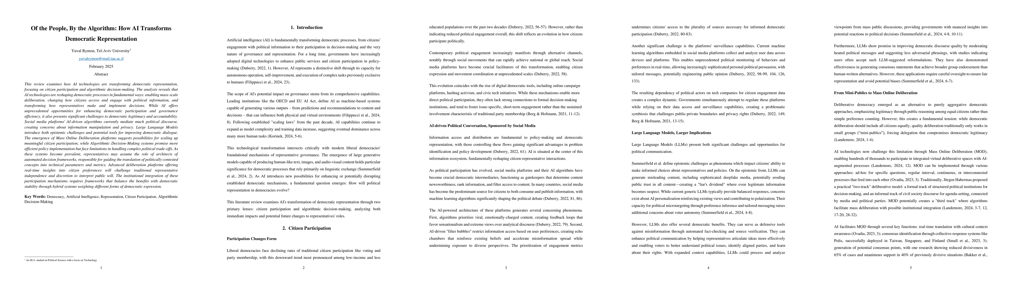 This review examines how AI technologies are transforming democratic representation, focusing on citizen participation and algorithmic decision-making. The analysis reveals that AI technologies are reshaping democratic processes in fundamental ways: enabling mass-scale deliberation, changing how citizens access and engage with political information, and transforming how representatives make and implement decisions. While AI offers unprecedented opportunities for enhancing democratic participation and governance efficiency, it also presents significant challenges to democratic legitimacy and accountability. Social media platforms' AI-driven algorithms currently mediate much political discourse, creating concerns about information manipulation and privacy. Large Language Models introduce both epistemic challenges and potential tools for improving democratic dialogue. The emergence of Mass Online Deliberation platforms suggests possibilities for scaling up meaningful citizen participation, while Algorithmic Decision-Making systems promise more efficient policy implementation but face limitations in handling complex political trade-offs. As these systems become prevalent, representatives may assume the role of architects of automated decision frameworks, responsible for guiding the translation of politically contested concepts into technical parameters and metrics. Advanced deliberation platforms offering real-time insights into citizen preferences will challenge traditional representative independence and discretion to interpret public will. The institutional integration of these participation mechanisms requires frameworks that balance the benefits with democratic stability through hybrid systems weighting different forms of democratic expression.
