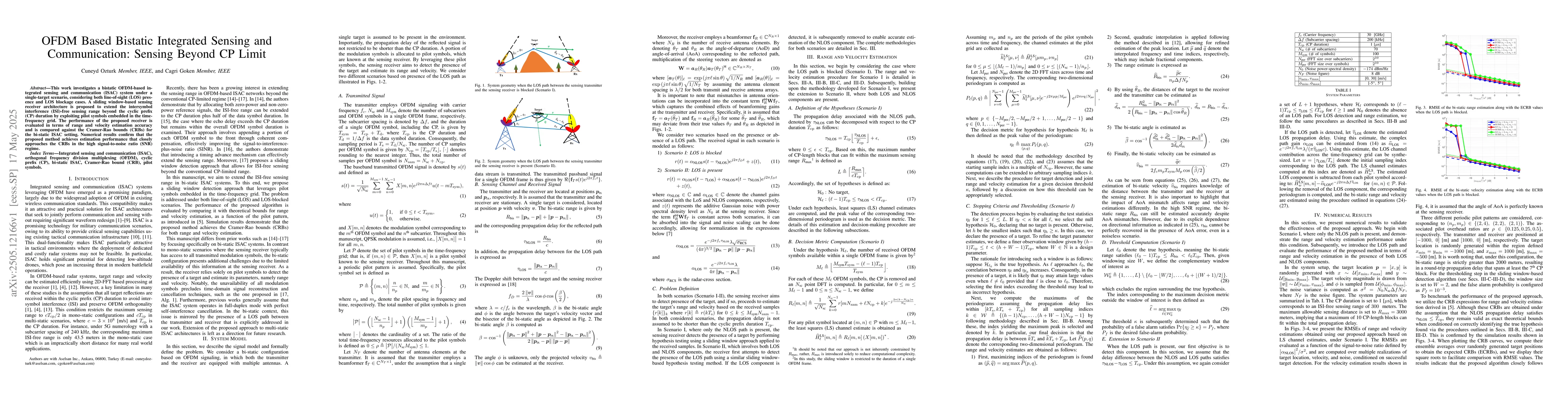 Researchers propose a bistatic OFDM-based system for integrated sensing and communication that extends sensing range beyond cyclic prefix limits using pilot symbols. The proposed method achieves estimation performance close to the Cramer-Rao bounds in high signal-to-noise regimes.