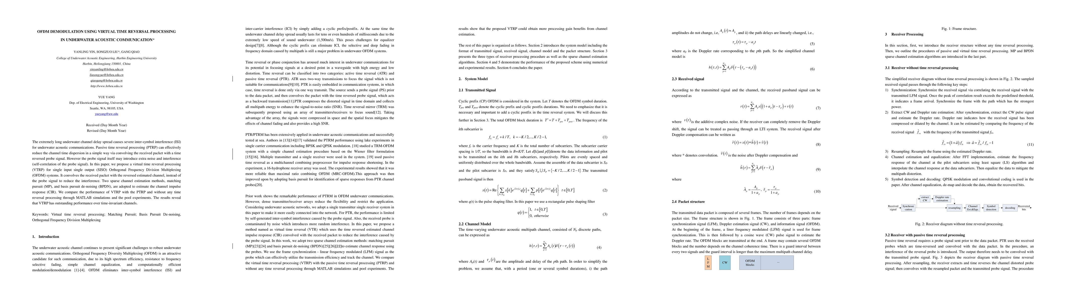 This paper proposes virtual time reversal processing (VTRP) for OFDM demodulation in underwater acoustic communication to mitigate inter-symbol interference. It estimates the channel impulse response using sparse methods and compares VTRP's performance with passive time reversal processing and no processing, showing superior results.