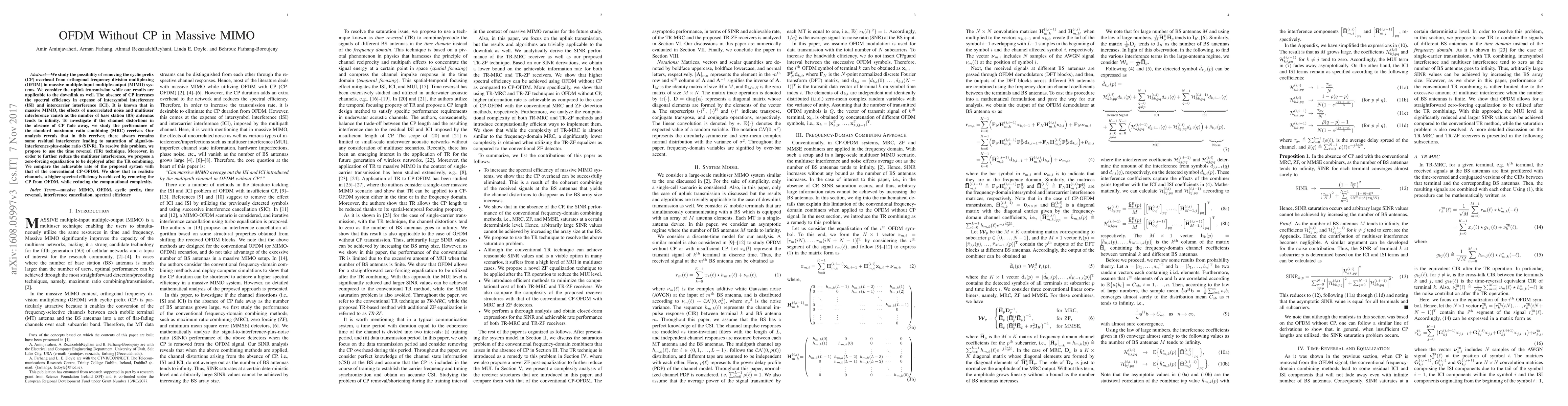 The paper introduces a novel approach to OFDM transmission in massive MIMO systems without CP, utilizing time reversal and zero-forcing equalization to mitigate residual interference and achieve higher spectral efficiency.