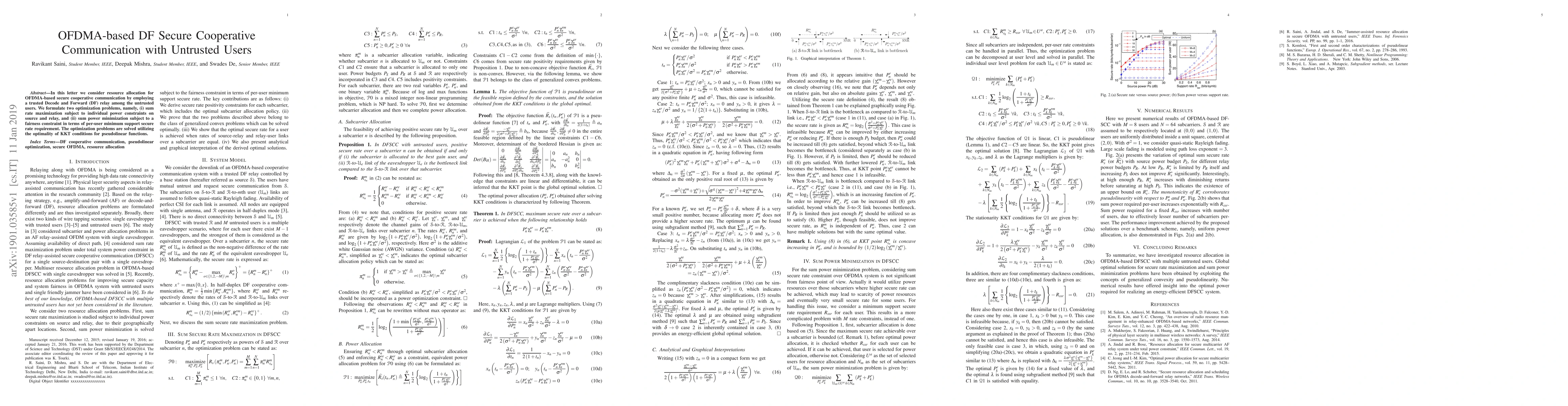 This paper explores resource allocation for secure cooperative communication in an OFDMA system using a trusted DF relay among untrusted users. It formulates optimization problems to maximize sum rate and minimize sum power, solved via KKT conditions for pseudolinear functions.