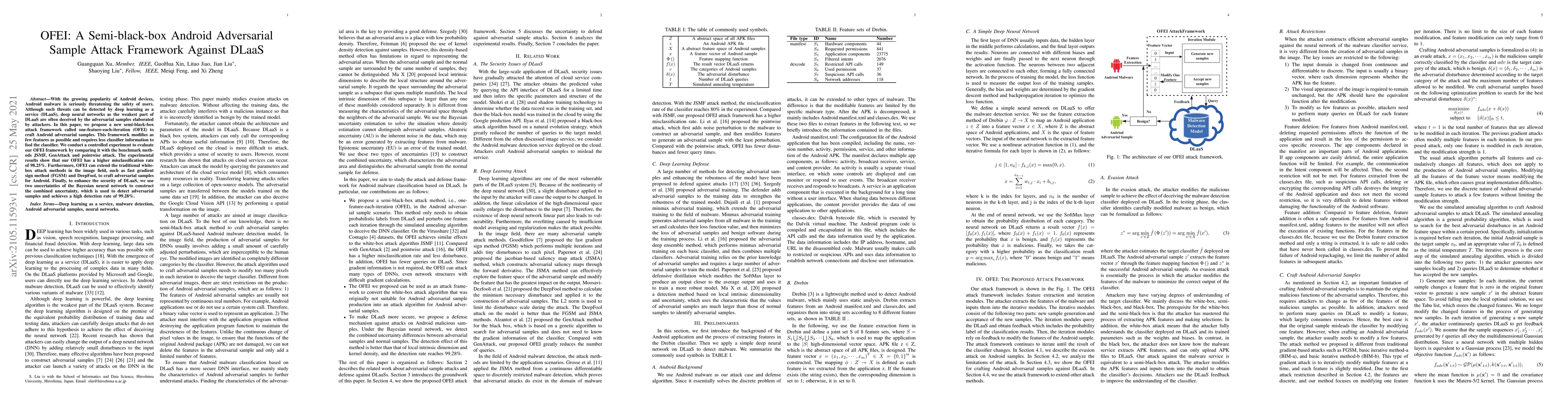This paper introduces OFEI, a semi-black-box attack framework for crafting Android adversarial samples that deceive deep learning as a service (DLaaS) classifiers. OFEI demonstrates a higher misclassification rate of 98.25% compared to benchmark methods and enhances DLaaS security through a combined uncertainty detection method achieving a 99.28% detection rate.
