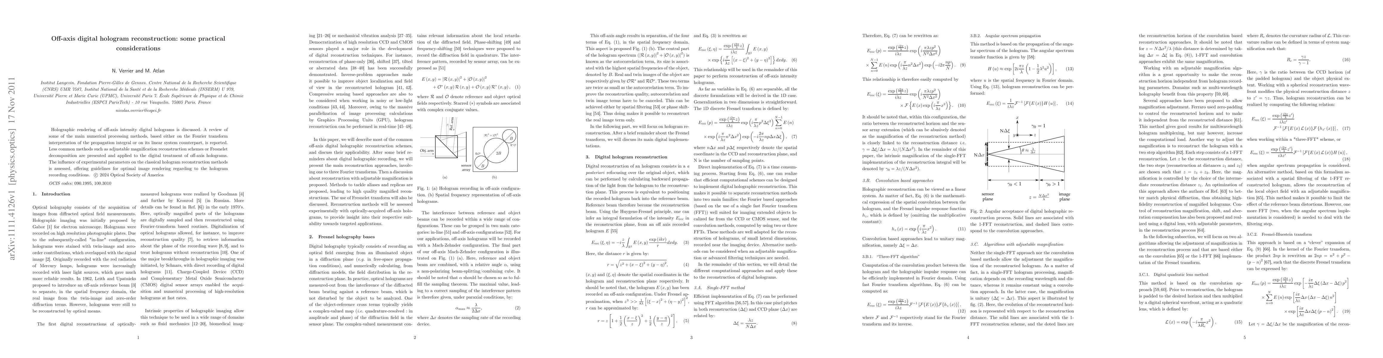 This paper reviews numerical methods for reconstructing off-axis digital holograms, including Fourier transform and linear system approaches, and explores less common techniques like adjustable magnification and Fresnelet decomposition. It provides guidelines for optimal image rendering based on experimental parameters.