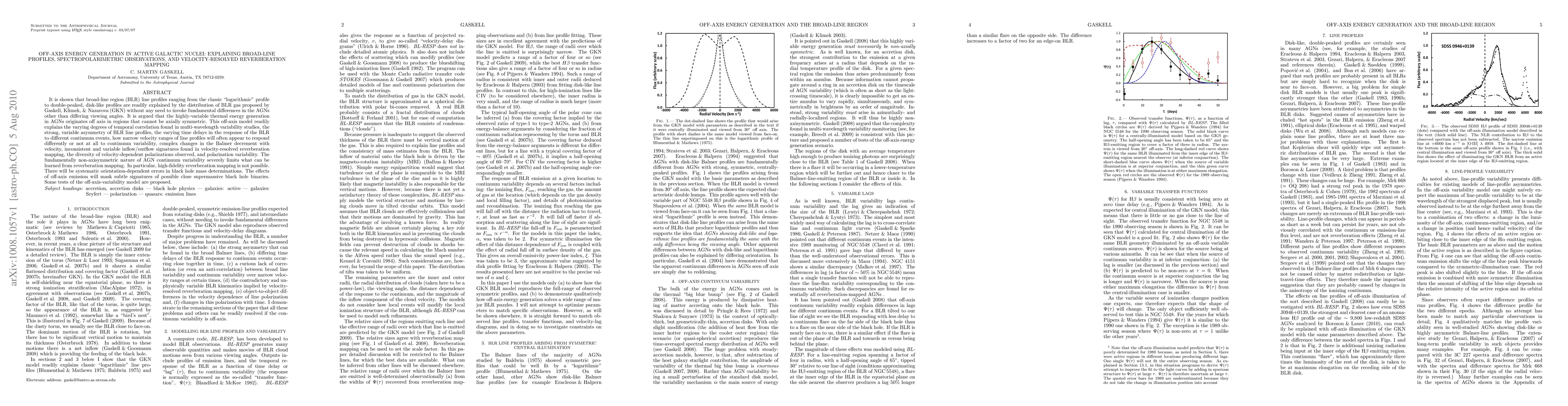 It is shown that broad-line region (BLR) line profiles ranging from the classic "logarithmic" profile to double-peaked, disk-like profiles are readily explained by the distribution of BLR gas proposed by Gaskell, Klimek, & Nazarova (2007; GKN) without any need to invoke fundamental differences in the AGNs other than differing viewing angles. It is argued that the highly-variable thermal energy generation in AGNs originates off axis in regions that cannot be axially symmetric. This off-axis model readily explains the varying degrees of temporal correlation found in multi-wavelength variability studies, the strong, variable asymmetry of BLR line profiles, the varying time delays in the response of the BLR to different continuum events, how narrow velocity ranges of line profiles will often appear to respond differently or not at all to continuum variability, complex changes in the Balmer decrement with velocity, inconsistent and variable inflow/outflow signatures found in velocity-resolved reverberation mapping, the diversity of velocity-dependent polarizations observed, and polarization variability. The fundamentally non-axisymmetric nature of AGN continuum variability severely limits what can be learned from reverberation mapping. In particular, high-fidelity reverberation mapping is not possible. There will be systematic orientation-dependent errors in black hole mass determinations. The effects of off-axis emission will mask subtle signatures of possible close supermassive black hole binaries. Some tests of the off-axis-variability model are proposed.