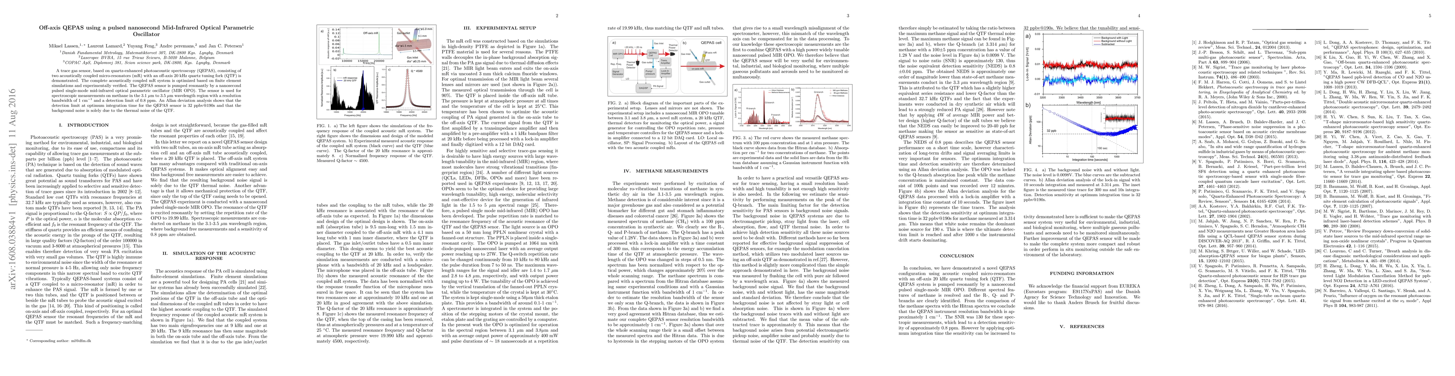 This paper presents a QEPAS-based trace gas sensor utilizing an off-axis quartz tuning fork and a nanosecond pulsed mid-infrared optical parametric oscillator for methane detection. The sensor achieves a resolution of 1 cm^-1 and a detection limit of 0.8 ppm, with background noise attributed to the thermal noise of the tuning fork.