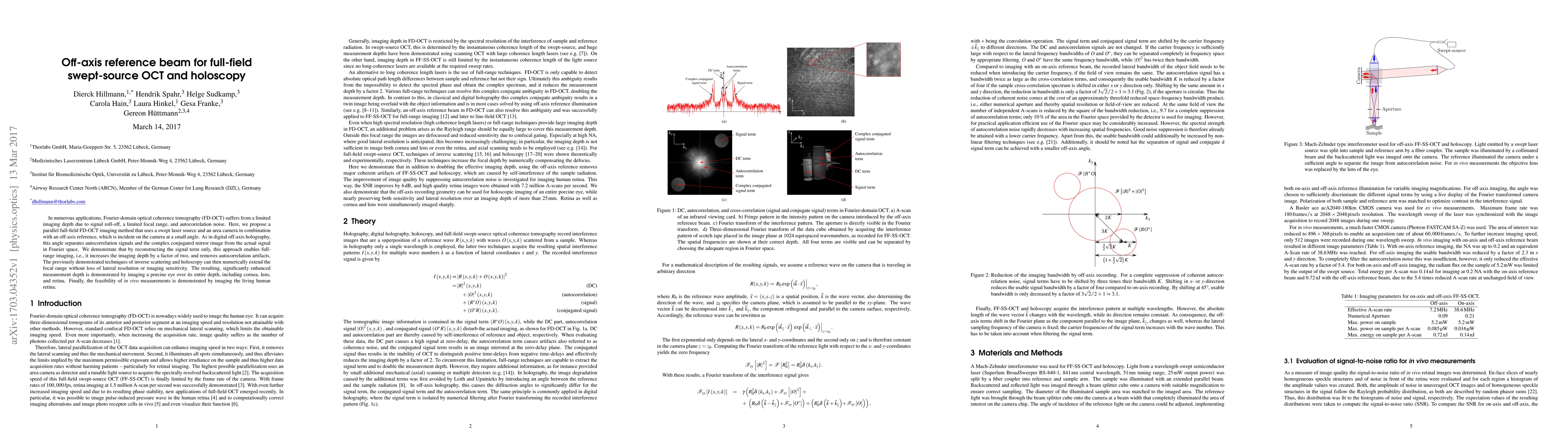 This paper proposes a parallel full-field Fourier-domain OCT method using an off-axis reference beam to enhance imaging depth and remove autocorrelation artifacts, achieving a twofold increase in depth and enabling extended focal range imaging. The technique is successfully demonstrated through imaging of porcine and human retinas.