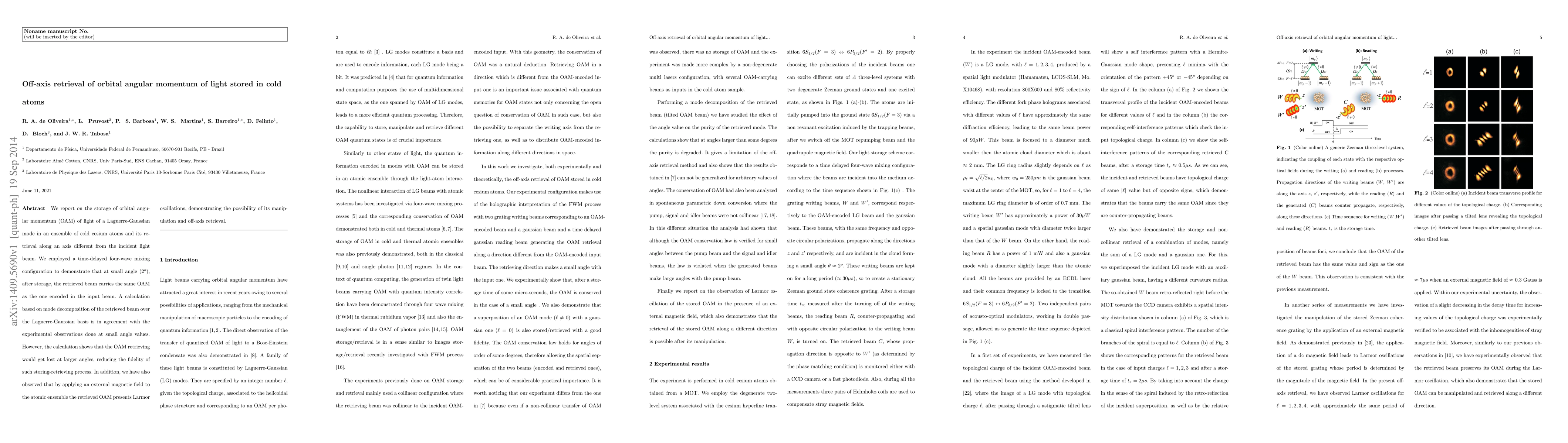 We report on the storage of orbital angu- lar momentum (OAM) of light of a Laguerre-Gaussian mode in an ensemble of cold cesium atoms and its re- trieval along an axis different from the incident light beam. We employed a time-delayed four-wave mixing configuration to demonstrate that at small angle (2o), after storage, the retrieved beam carries the same OAM as the one encoded in the input beam. A calculation based on mode decomposition of the retrieved beam over the Laguerre-Gaussian basis is in agreement with the experimental observations done at small angle values. However, the calculation shows that the OAM retrieving would get lost at larger angles, reducing the fidelity of such storing-retrieving process. In addition, we have also observed that by applying an external magnetic field to the atomic ensemble the retrieved OAM presents Larmor oscillations, demonstrating the possibility of its manipulation and off-axis retrieval.