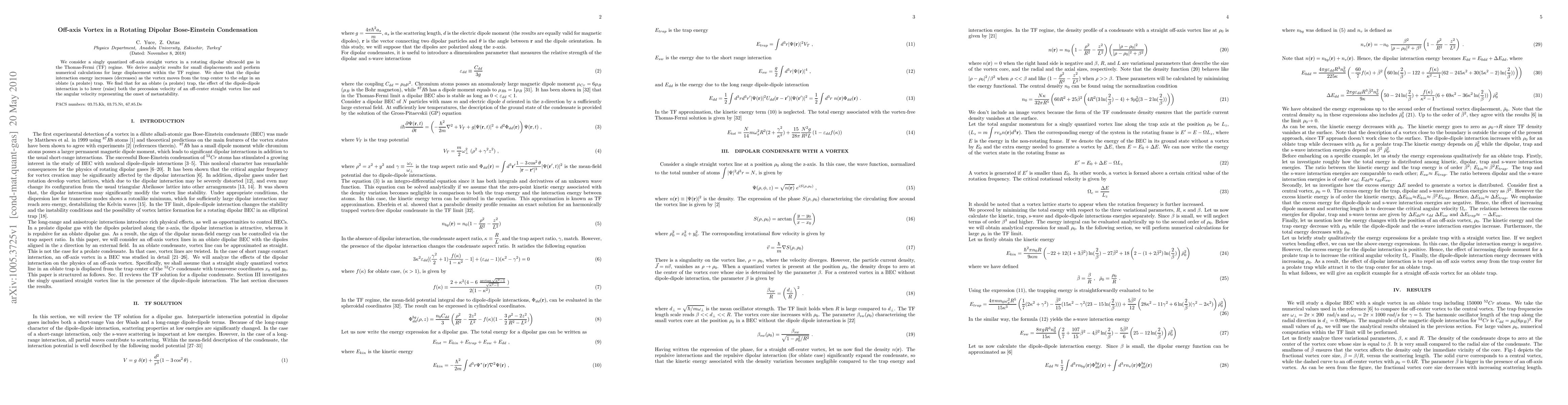 This paper investigates a singly quantized off-axis vortex in a rotating dipolar Bose-Einstein condensate, deriving analytical and numerical results for its behavior in the Thomas-Fermi regime. It finds that the dipolar interaction energy varies with vortex displacement, affecting the precession velocity and angular velocity differently in oblate versus prolate traps.
