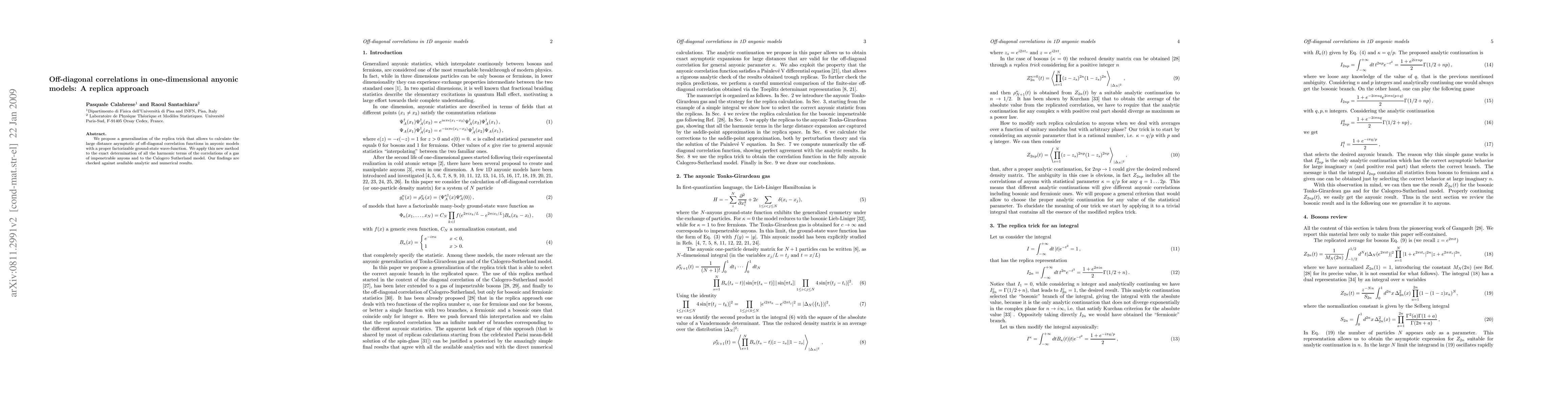 This paper proposes a generalized replica trick to calculate the asymptotic behavior of off-diagonal correlations in one-dimensional anyonic models, applying it to determine harmonic terms in the correlations of impenetrable anyons and the Calogero Sutherland model, with results verified against existing analytic and numerical data.