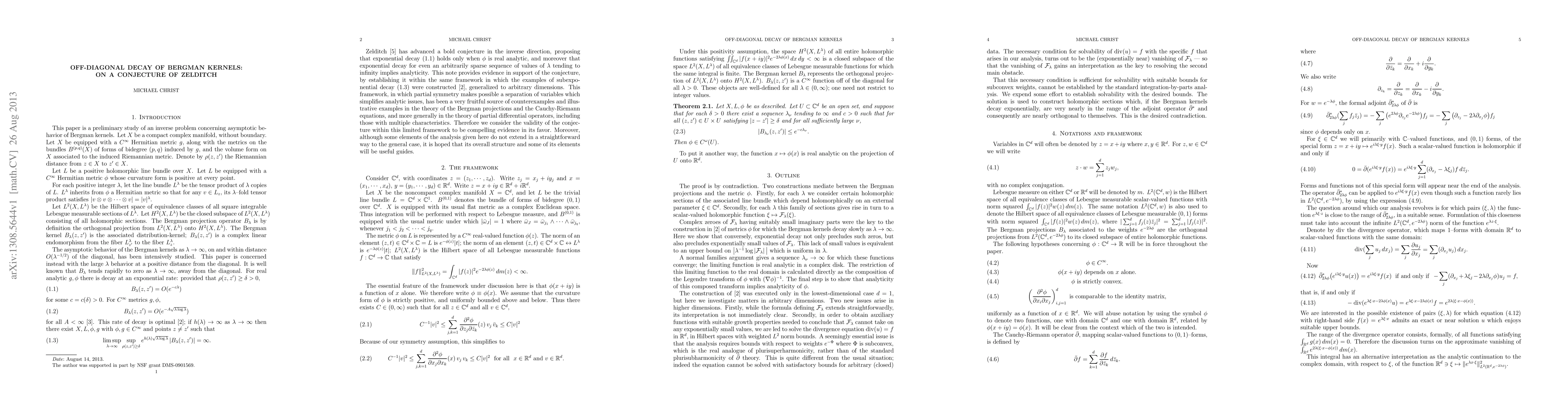 Consider a complex line bundle over a compact complex manifold equipped with an infinitely differentiable metric with strictly positive curvature form. Assign to positive tensor powers of this bundle the associated product metrics and Bergman projection operators. Zelditch has conjectured that if the Bergman kernels, away from the diagonal, decay exponentially fast to zero as the power tends to infinity, then the metric must be real analytic. Moreover, this is conjectured even if exponential decay is assumed to hold merely for some arbitrarily sparse subsequence of powers tending to infinity. Previously the author has constructed examples in which the metric is infinitely differentiable, but exponential decay does not hold. These examples are within a framework in which a certain degree of symmetry is present. In the present paper we prove the conjecture for all structures within this framework, thus providing evidence in favor of the conjecture. The analysis is carried out for base manifolds of arbitrary dimensions, rather than only for dimension one as in the author's previous work.