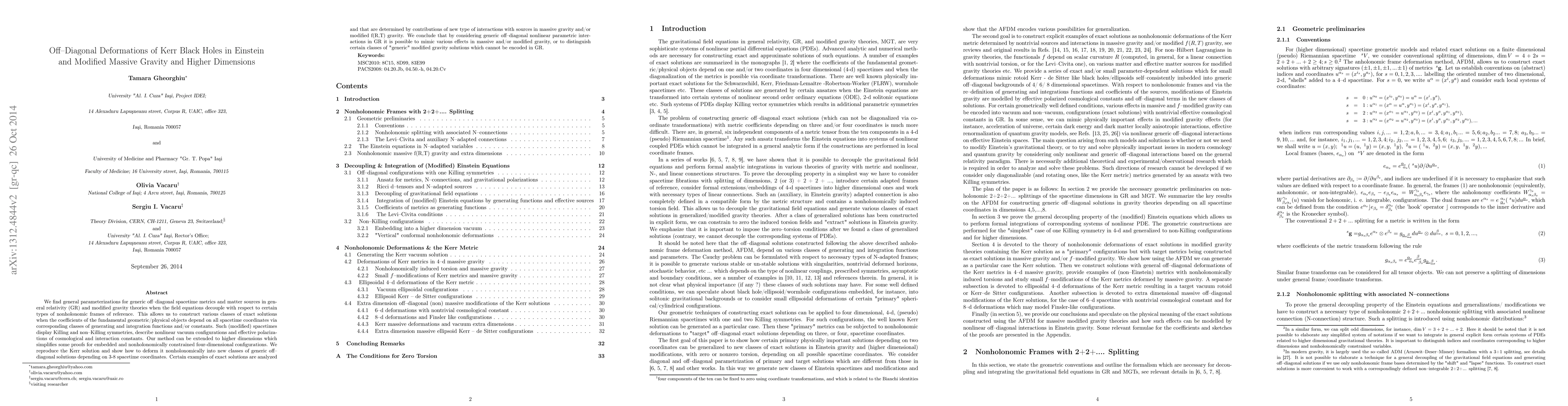 This paper explores general parameterizations for off-diagonal spacetime metrics and matter sources in both general relativity and modified gravity theories, focusing on decoupling field equations in nonholonomic frames. It constructs exact solutions displaying various symmetries and nonlinear vacuum configurations, extending the Kerr solution into new classes of off-diagonal solutions in higher dimensions.